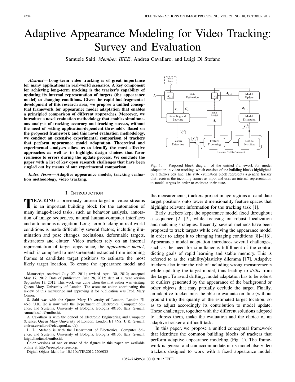 在本文中,我们提出了一个统一的概念框架,确定了常见的积木进行跟踪的自适应外观造型(图1)。该框架是一般性的,可以容纳在其模型也视频跟踪器的设计工作,有一个固定的外观模型,我们也提出了一个新的定量的性能评价方法,独立于阈值,它同时考虑跟踪估计精度和跟踪保持长–长期成功运作的能力。根据建议的框架和建议的评估方法的基础上,我们进行全面检讨现有的方法,并进行了深入的实验比较,使用公开的测试序列。我们批判性地讨论不同的算法在各种现实世界的情况下的性能,并突出自己的长处和短处。最后,基于这种分析,我们列出了主要的开放式研究的挑战,在自适应目标建模的视频跟踪。本文的结构安排如下:第二部分介绍了概念和定义,将整个文件;在第三节中,我们提出的目标模型更新的总体框架;在第四节中,我们提出并讨论所提出的评价方法;其次,第五部分描述了选定的跟踪和测试序列和第六部分提出实验比较。最后,第七节总结了主要贡献和突出的开放研究的挑战。