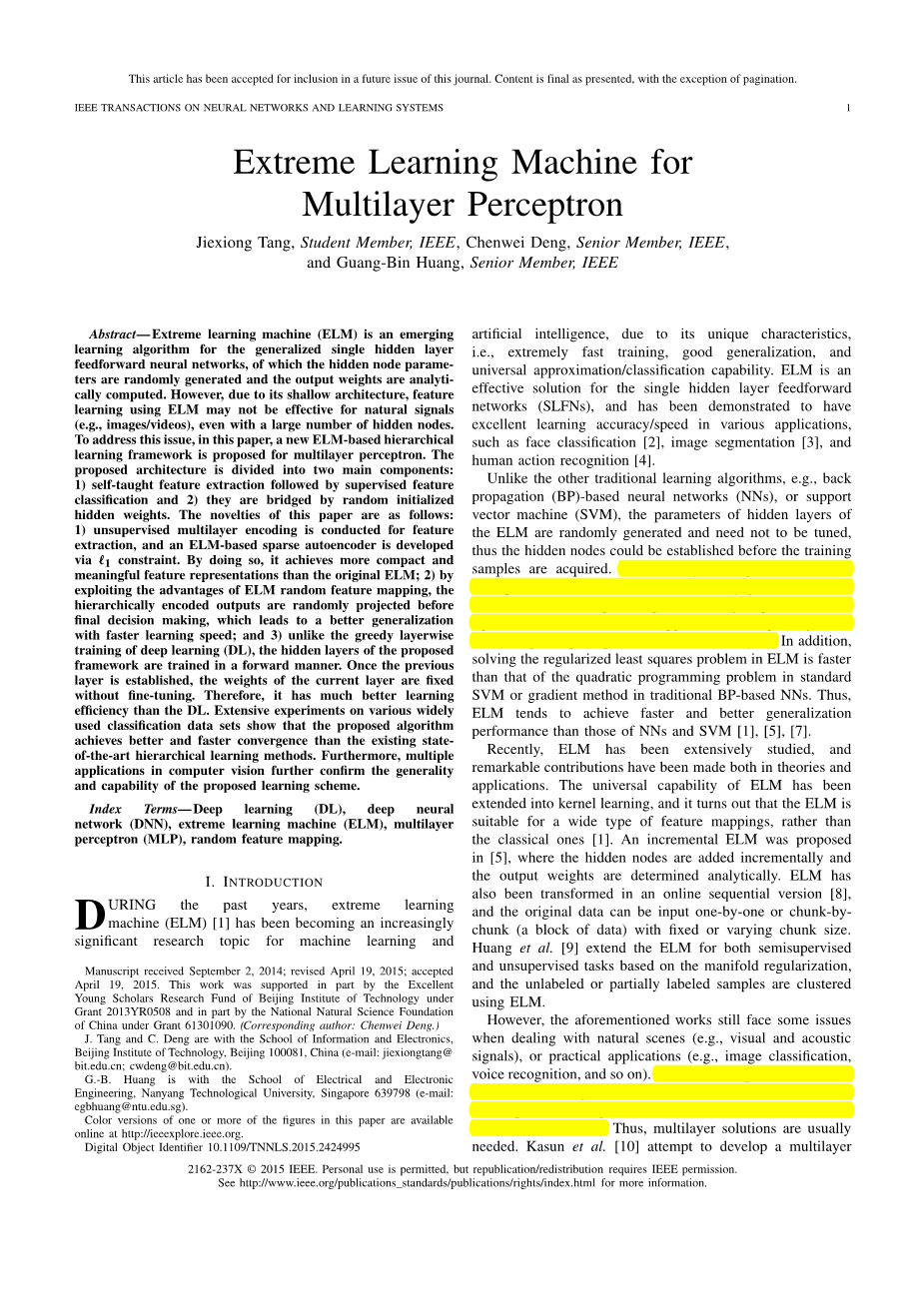 索引项:深度学习(DL),深度学习网络(DNN),极限学习机(ELM),多层感知机(MLP),随机特征映射
