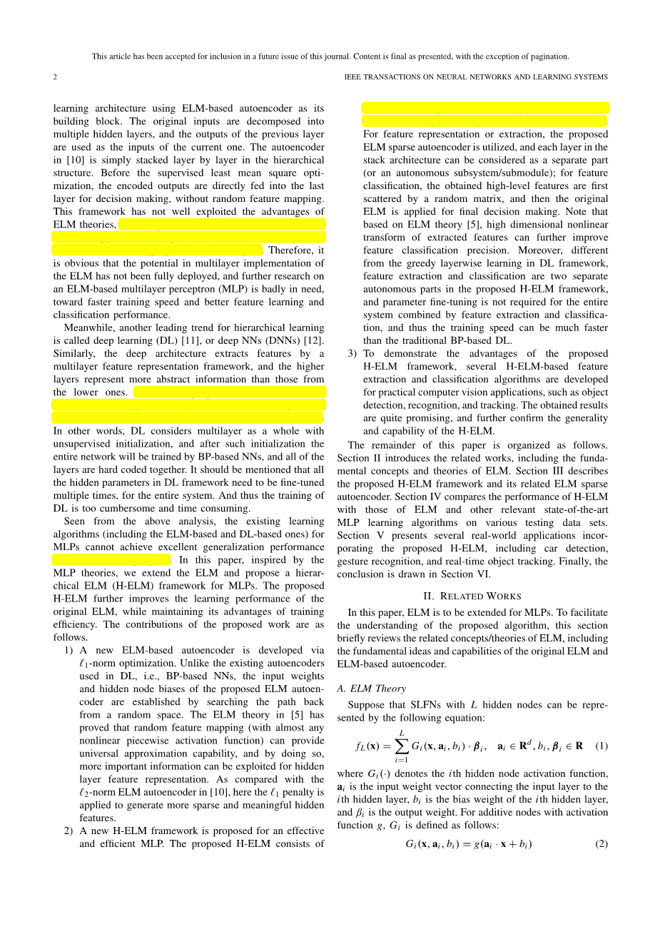 本文的余下部分组织如下。第II部分介绍包括ELM的基本概念和理论的相关作品。第III部分描述推荐的H-ELM的结构和它相关的ELM稀疏自编码器。第IV部分在不同的测试集上比较H-ELM与ELM及其他相关的先进算法的表现。第V部分呈现该H-ELM几种现实的应用包括车辆检测、手势识别和实时物体跟踪。最后,总结被置于第VI部分。