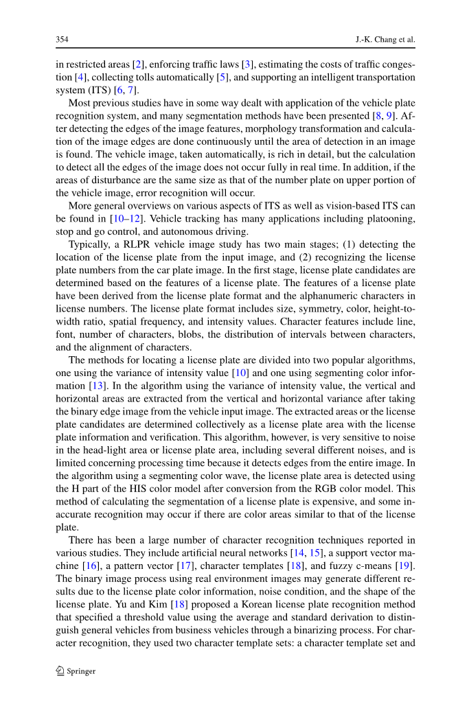在各种研究中已经报道了大量的字符识别技术。它们包括人造神经网络[14,15],支持向量机[16],模式向量[17],字符模板[18]和模糊c均值[19]。使用真实环境图像的二进制图像处理可能由于车牌颜色信息,噪音条件和车牌的形状而导致不同的结果。Yu和Kim [18]提出了韩国车牌识别方法,其使用平均和标准推导来指定阈值,以通过二值化过程来区分普通车辆与商用车辆。对于字符识别,它们使用两个字符模板集:一个字符模板集和一组数字模板。该方法的优点在于它具有详细的二进制图像。然而,它可能丢失可以帮助它确定字符的信息,导致字符匹配期间字符识别不正确。