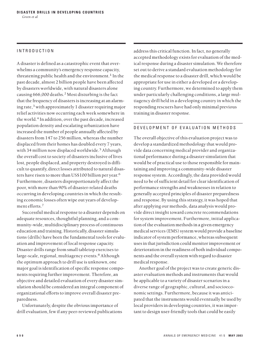 灾害模拟演习在全世界广泛使用,被认为是评估和改进地方灾害响应能力的基本工具。尽管如此,仍没有一种被普遍接受的方法,用于对灾害演习的医疗响应进行定量评估。因此,我们着手开发和前瞻性地测试一种综合方法,以在灾害模拟期间评估医疗救护者和组织绩效。由于灾害对发展中国家的人口造成了不成比例的影响,我们将这些方法设计得足够灵活,适用于发达国家和发展中国家。确定了灾害医疗响应的每个组成部分的客观结果措施,并将其纳入3个数据收集文书。派生的方法应用于危地马拉危地马拉城的多机构灾害模拟。在这项试点研究的基础上,提出了建议的修改和建议。客观地确定紧急医疗服务系统对灾难的医疗响应的具体优势和弱点的能力是优化系统性能的重要一步。根据我们的经验,我们建议在每次灾害模拟中加入客观评价方法。
