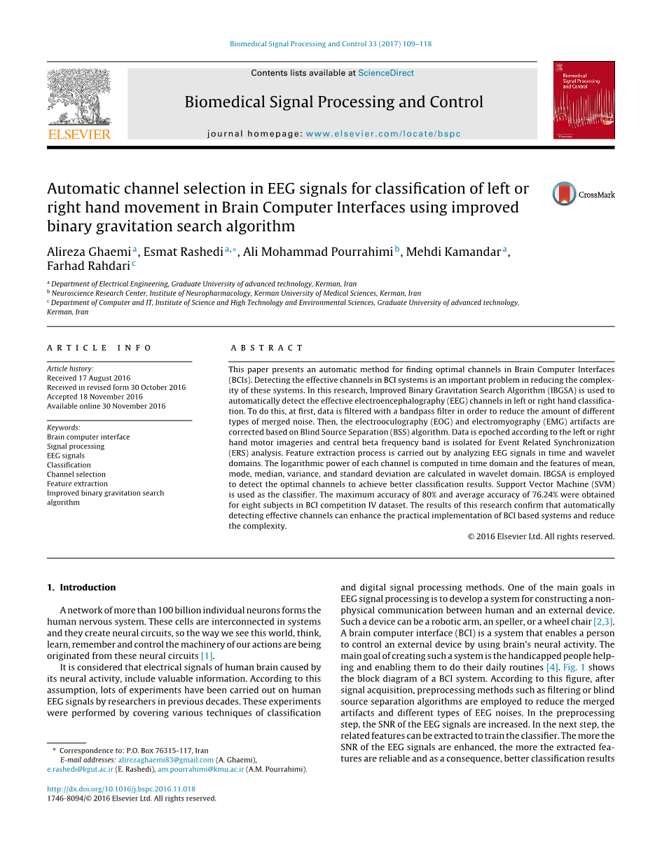 本文提出了一种在脑机接口(BCI)中找到最佳通道的自动方法。检测BCI系统中的有效信道是降低这些系统的复杂性的重要问题。在这项研究中,使用改进的二进制重力搜索算法(IBGSA)自动检测左手还是右手运动分类中的有效脑电图(EEG)通道。为此,首先使用带通滤波器对数据进行滤波,以便减少各种类型的噪声。然后,基于盲源分离(BSS)算法来校正眼电图(EOG)和肌电图(EMG)伪影。根据左侧或右侧运动成像来对数据进行划分,并且使用事件相关同步(ERS)分析来隔离中央beta;频带。通过分析时间和小波域中的EEG信号来进行特征提取。在时域中计算每个通道的对数功率,并且在小波域中计算平均值,模式,中值,方差和标准差。使用IBGSA检测最佳通道以实现更好的分类结果。支持向量机(SVM)作为分类器。该算法在BCI竞争第四数据集中的8个受试者上进行测试,获得80%的最大精度和76.24%的平均精度。本研究的结果证实,自动检测有效信道的方法可以增强BCI系统的实际性能并降低复杂度。