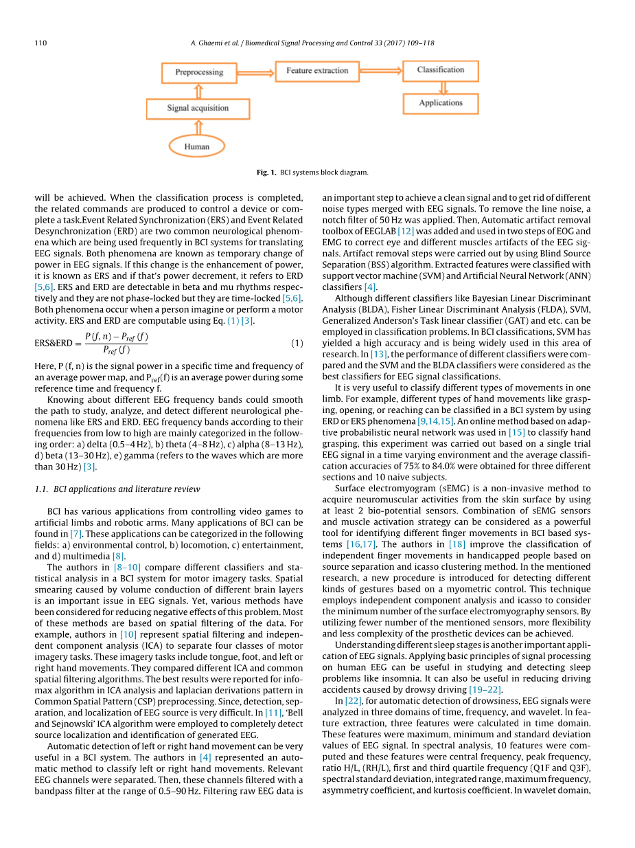 人类神经系统是一个由超过1000亿个神经元组成的网络。这些细胞在系统中相互连接,并且产生神经回路,因此,正是这些神经回路让我们能看到这个世界,思考,学习,记忆和控制我们的行为[1]。由其神经活动引起的人脑的电信号中含有重要的信息。根据这个假设,研究人员在过去几十年对人类EEG信号进行了大量的实验。这些实验涉及到各种分类技术和数字信号处理方法。EEG信号处理的主要目标之一是开发一种用于构建人与外部设备之间的非生理交流的系统。这种装置可以是机器臂,拼写装置或轮椅[2,3]。脑机接口(BCI)是一种使人能够通过脑的神经活动来控制外部设备的系统。构建这种系统的主要目的是帮助残疾人并使他们的日常生活能够自理 [4] 。图1是BCI系统的框图。图中显示,在信号采集之后,采用诸如滤波或盲源分离算法的预处理方法来减少各种人为噪声和各种EEG噪声。