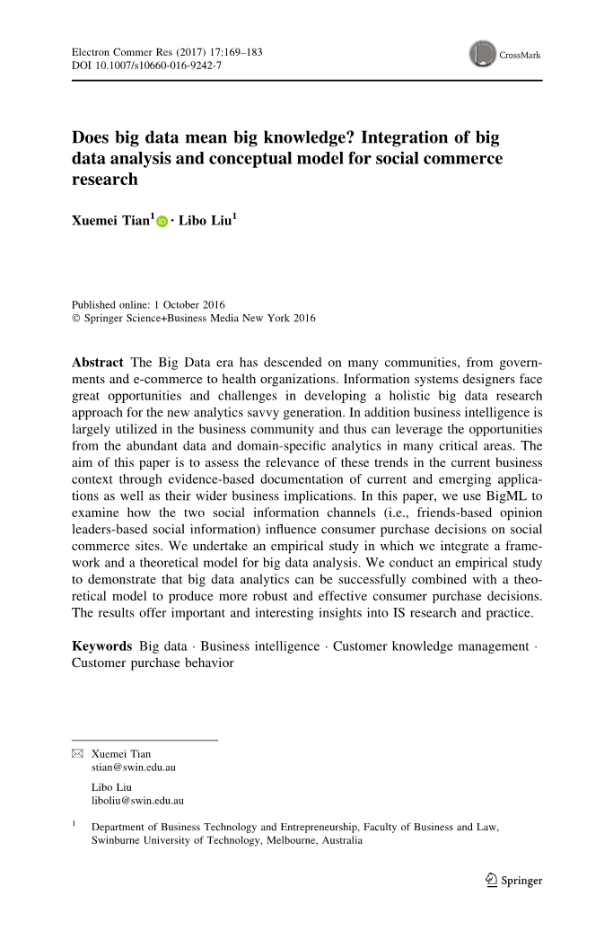 摘要:大数据时代已经降临在很多社区团体上了,从政府、电子商务到健康组织。信息系统的设计师在为分析有见识的一代开发一种完善的大数据研究方法上面临着大的机遇和挑战。除此之外,商业智能主要在商业社区中使用,因此可以在许多关键领域利用丰富的数据和特定的分析方法来创造机会。本文的目的是通过当前和新兴的实证文档以及它们更广泛的业务影响来评估这些趋势在当前业务环境中的相关性。在这篇文章里,我们使用BigML来研究两个社交信息渠道(即基于朋友的意见和基于领导者的社交信息)如何影响社交商务网站上消费者的购买决策。我们进行了一项实证研究,在该实证研究中,我们为大数据研究整合了一个框架和理论模型,以证明大数据分析可以成功与理论模型相结合,产生更强大,更有效的消费者购买决策。该结果为IS研究和实践提供了重要而有趣的见解。