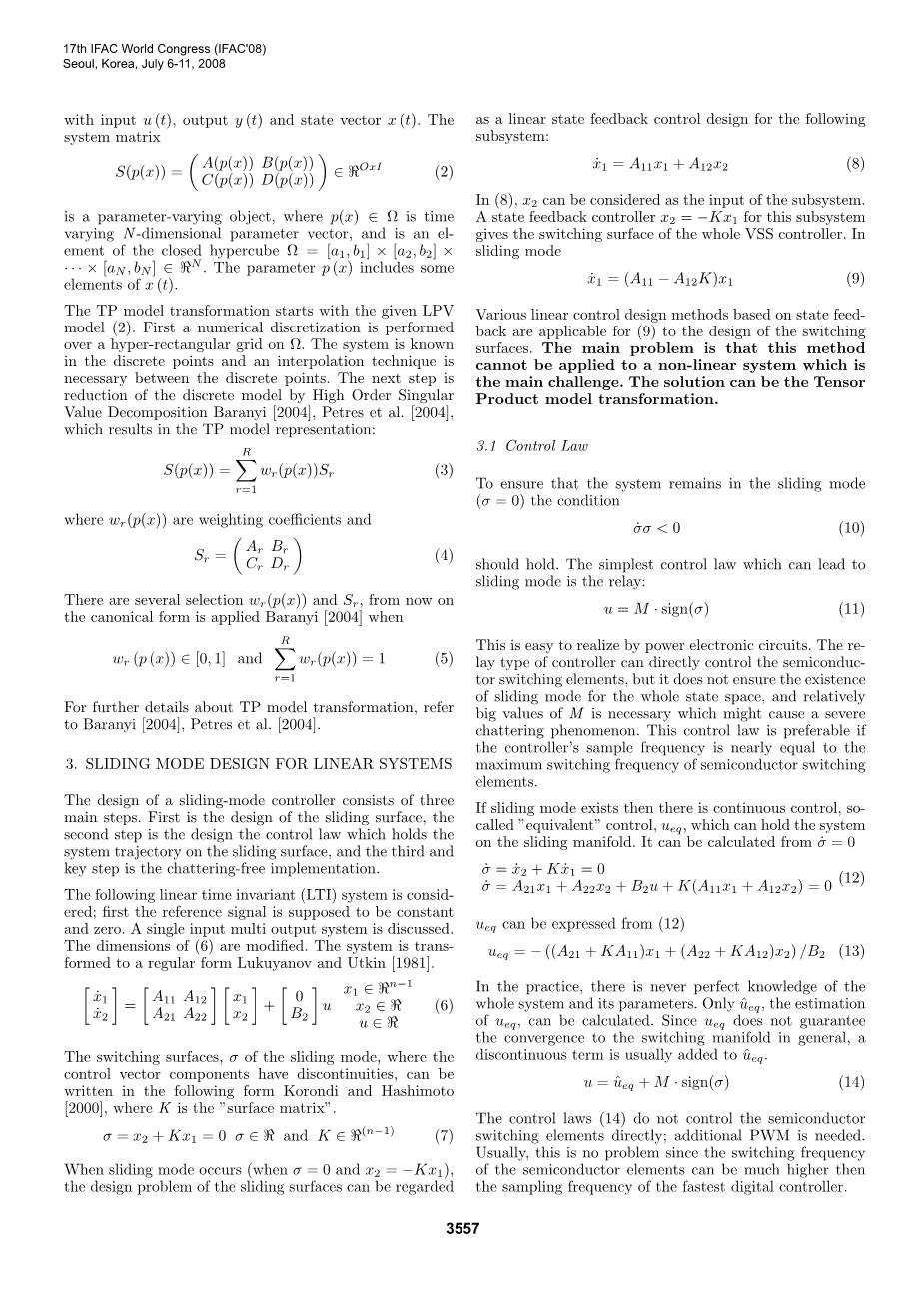 基于状态反馈的各种线性控制设计方法适用于(9)开关表面的设计。主要的问题是这种方法不能应用于非线性系统,这是主要的挑战。该解决方案可以是张量积模型转换。