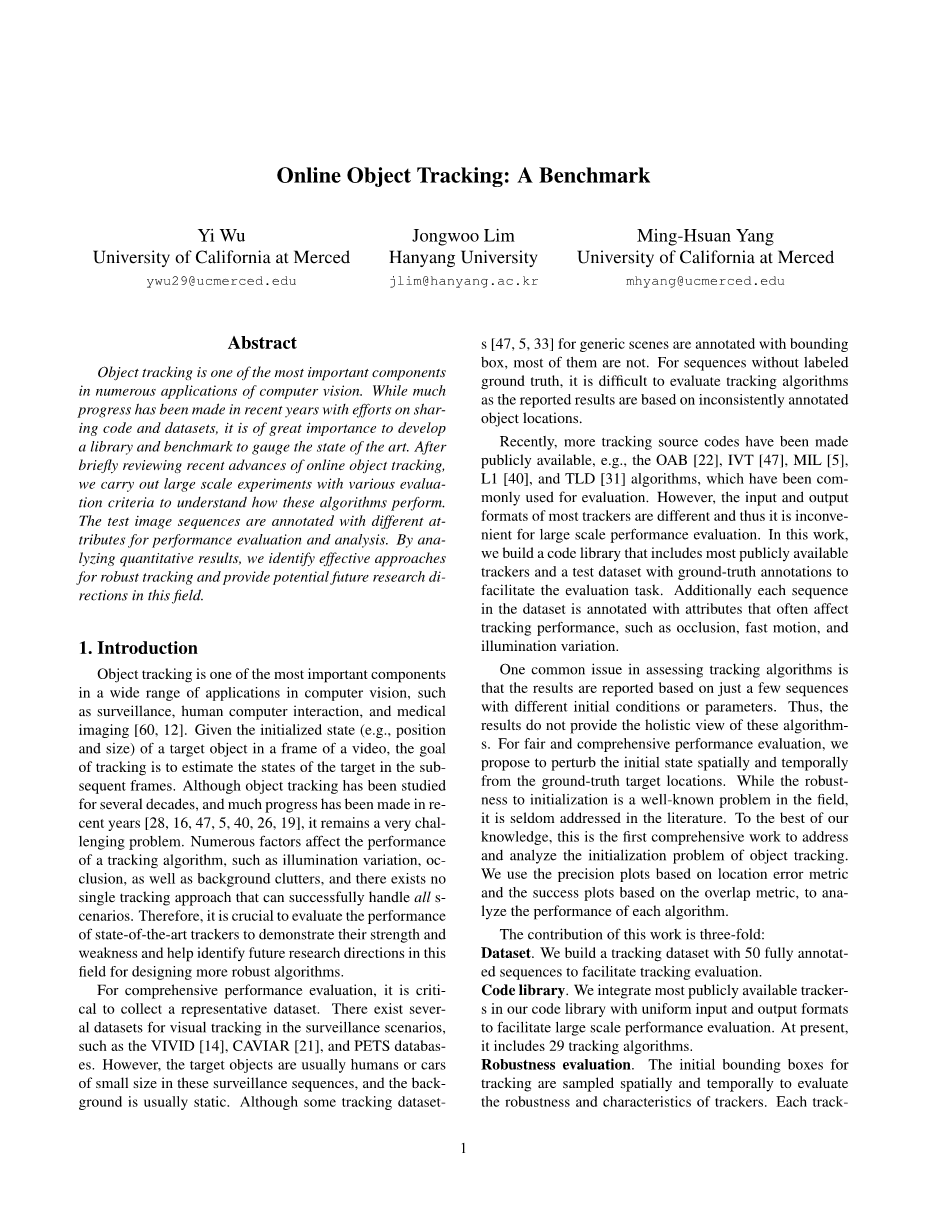 本工作主要专注于单目标的在线[1]跟踪。代码库、标注好的数据集和所有的跟踪结果在本网站上可以获得http://visualtracking.net。