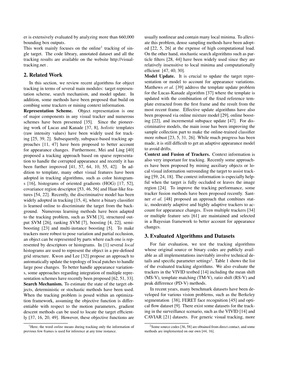 模型更新 更新目标表示或目标模型以反映外观变化是至关重要的。Matthews等人[39]提出了Lucas-Kanade算法[37]中的模板更新问题,其模板通过联合从第一帧中抽取的固定参考模板和最近一帧的结果的组合来更新。有效的更新算法是基于在线混合模型[29]、在线boosting[22]和增量子空间更新[47]提出来的。对于区分性模型,主要问题是改进样本采集部分,让在线训练得到的分类器更加鲁棒[23, 5, 31, 26]。即便已经取得了许多进步,但寻找避免跟踪漂移的一种自适应的表观模型仍是十分困难的。