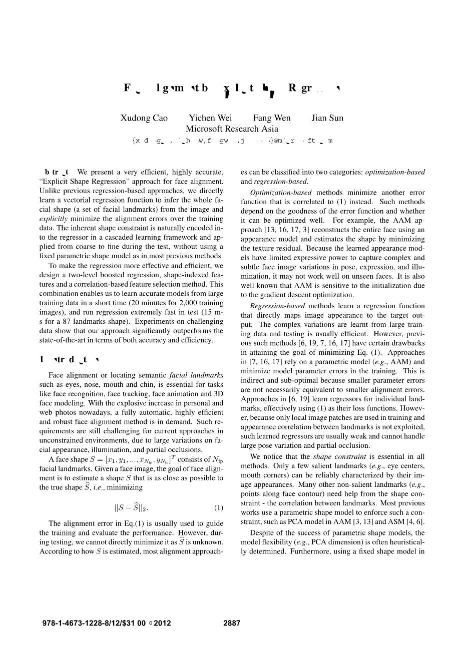 在这篇文章中,我们将呈现一种新颖的基于回归的人脸对齐方法,在这个方法中我们没有采用任何参数形状模型。通过训练数据明确地最小化对齐误差函数来训练出回归量。所有的面部特征点都以一个向量输出。我们的回归量实现了没有参数的形状约束方法:这个回归的形状都是所有训练图片形状的一个线性组合。此外,使用整个面部特征应用于所有的特征点中比使用独立的特征点小区域更有效。这些能够使我们训练出一个灵活的模型。我们称这种方法为“显式形状回归”。