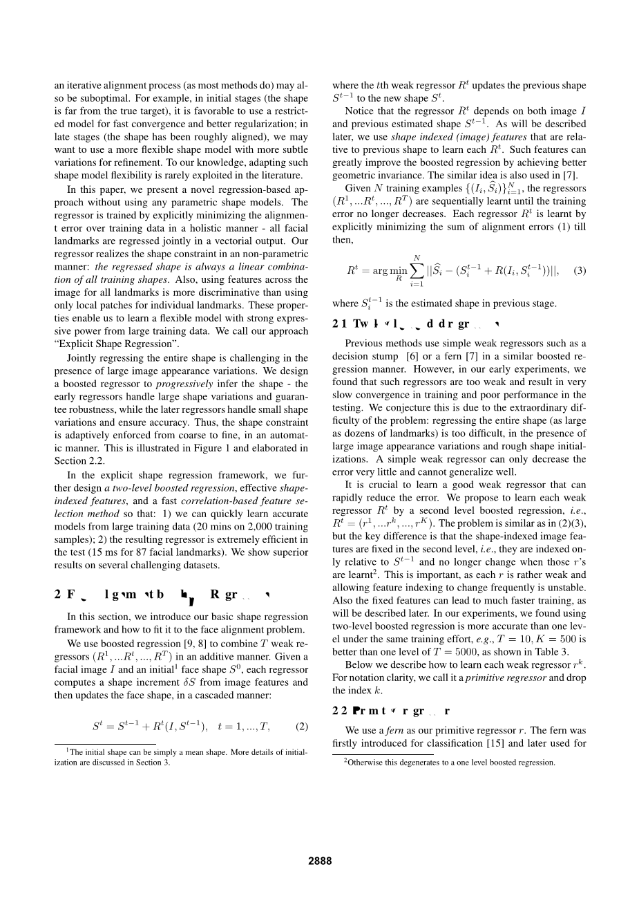 注意到这个回归量同时依赖于图片和之前估算的形状。我们将会在之后进行详细说明。我们使用了和之前的形状有关联的形状索引特征学习每一个。这样的特征能够提高增强回归实现更好的几何不变性。这个同样的方法也在[7]中使用。