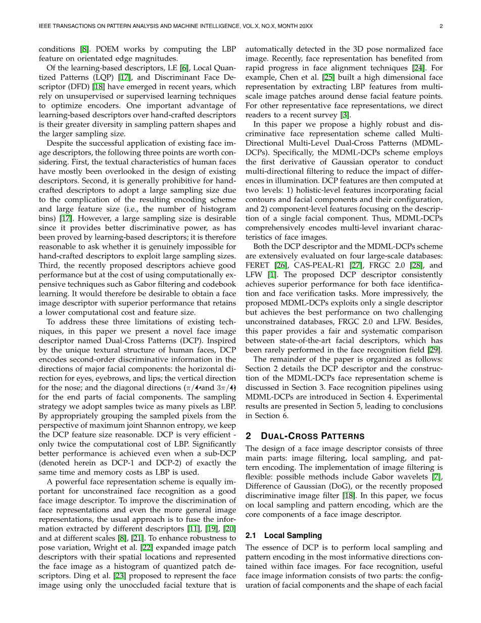 在本文中,我们提出了一个非常强大并且有很强的区分能力的人脸表示方法称为多方向多层次的双十字图案(MDML-DCPs)。 具体而言,该方案利用高斯算子的一阶导数进行多向过滤,从而减少光照差异的影响。本文将在整体和局部分别计算出DCP特征。其一是整体的特点,结合面部轮廓和面部组件及其配置。其二局部的特点,是针对于一个人脸中每个组成部分的描述。因此,该方法能够得到综合编码多层次不变特征的人脸图像。