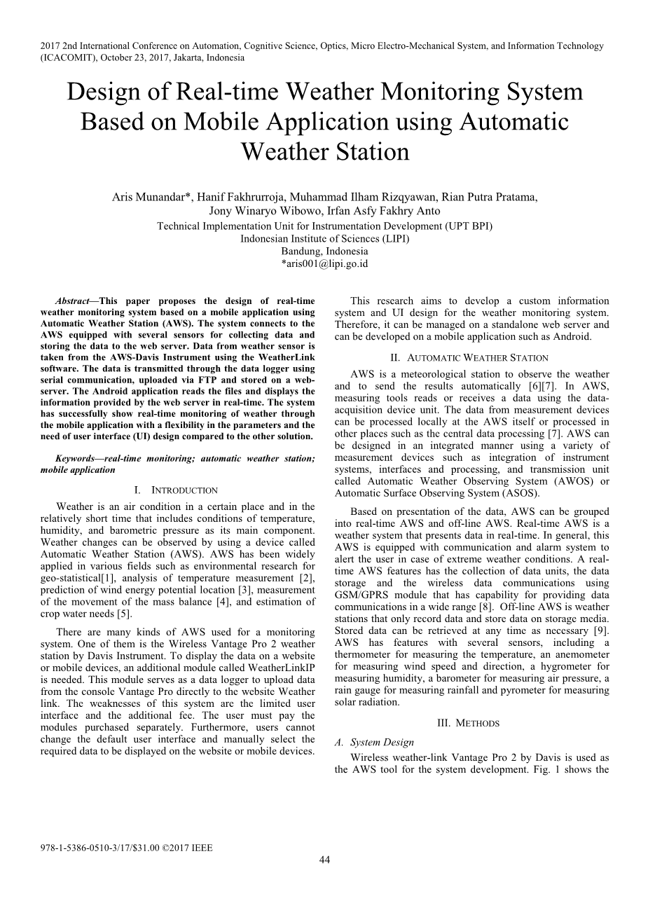 摘要——这篇文章提出了一种基于自动气象站(AWS)的移动应用实时天气监测系统的设计方案。该系统连接到具有多个传感器的AWS,用于收集数据并将数据存储到Web服务器。天气传感器的数据来自AWS-Davis仪器,使用WeatherLink软件。数据通过数据记录器通过串行通信传输,通过FTP上传并存储在Web服务器上。Android应用程序读取文件并实时显示Web服务器提供的信息。该系统通过移动应用成功地实现了对天气的实时监测,与其他解决方案相比,在参数和用户界面设计上具有一定的灵活性。