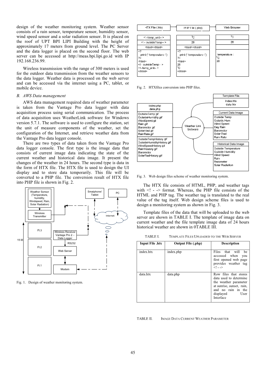 戴维斯的无线天气链接Vantage Pro 2被用作系统开发的AWS工具。图1显示了天气监测系统的设计。天气传感器由雨传感器、温度传感器、湿度传感器、风速传感器和太阳辐射传感器组成。它被安置在UPT BPI LIPI大楼的屋顶上,离地面大约17米高。它放在PC服务器上,数据记录器放在二楼。Web服务器可以通过IP 192.168.236.99在http://meas.bpi.lipi.go.id上访问。