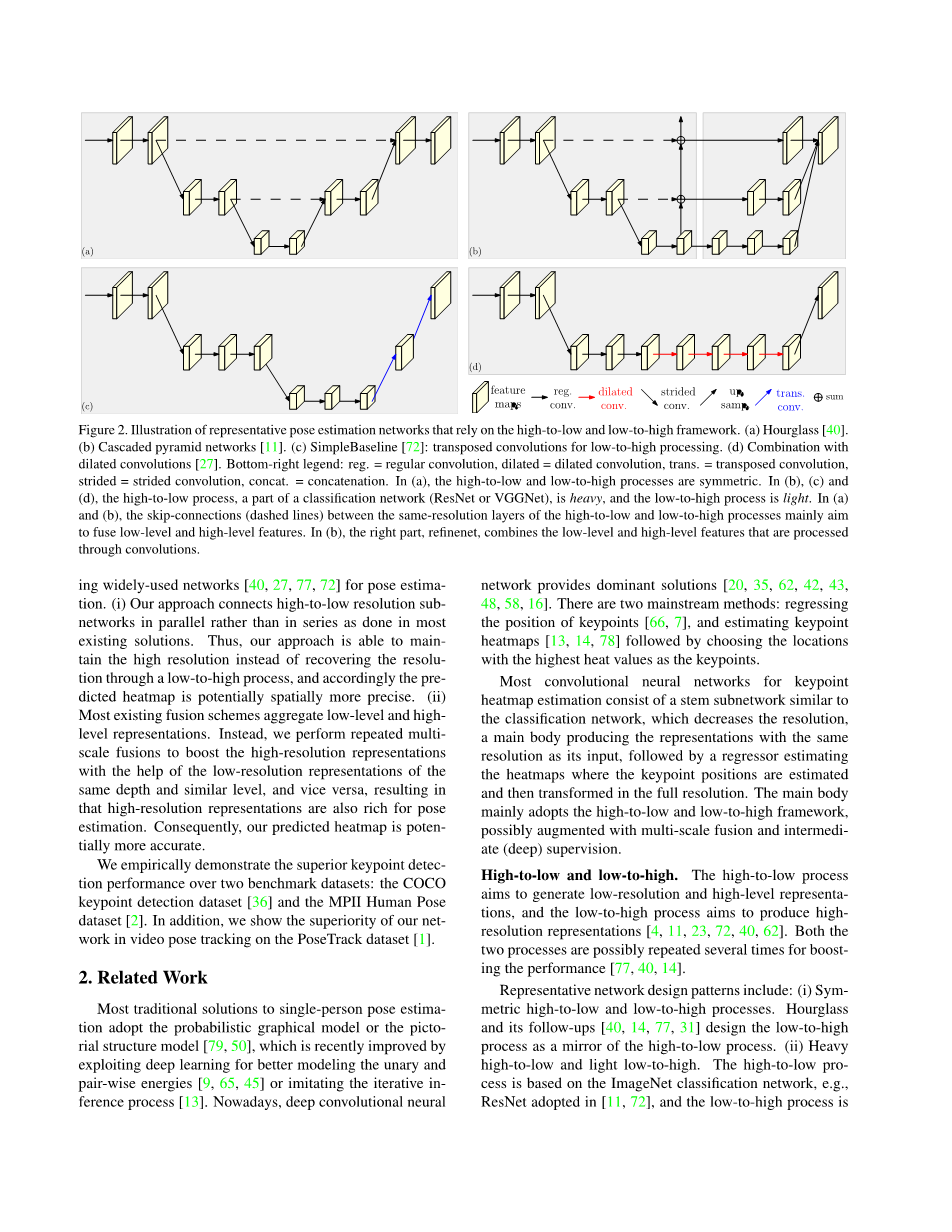 (iii)Combination with dilated convolutions。在[27,51,35]中,ResNet或VGGNet在最后两个阶段都采用了扩张性卷积来消除空间分辨率的损失,然后采用由light lowto-high process来进一步提高分辨率,避免了仅使用dilated convolutions的昂贵的计算成本[11,27,51]。图2描述了四种具有代表性的姿态估计网络。