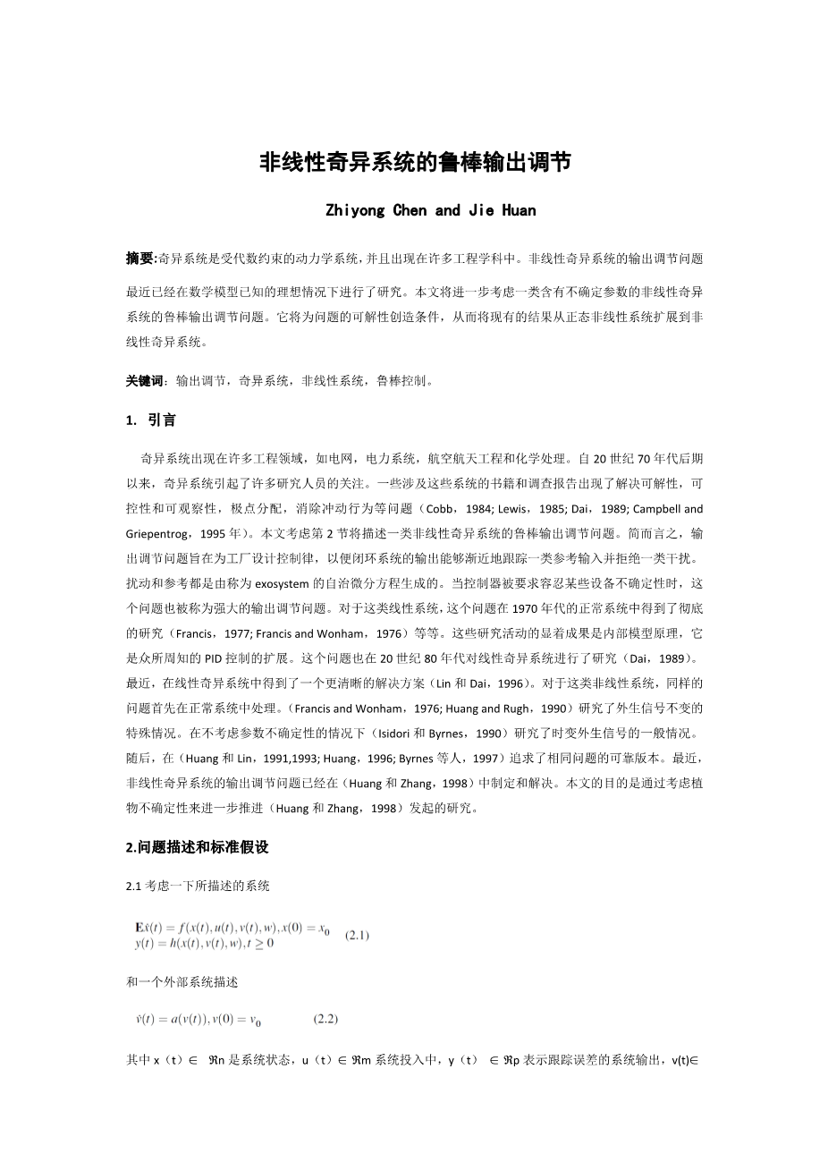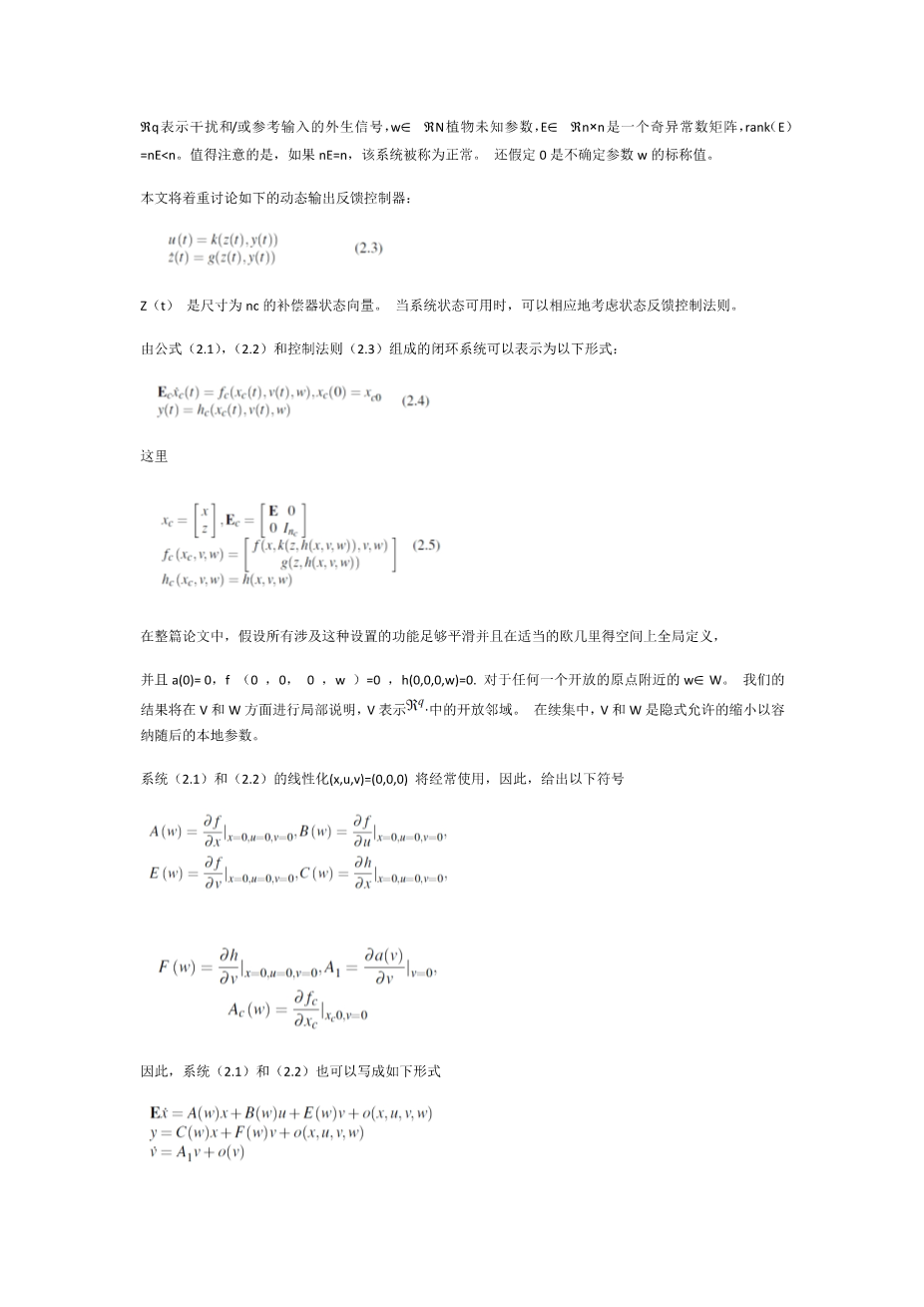 非线性奇异系统的鲁棒输出调节外文翻译资料