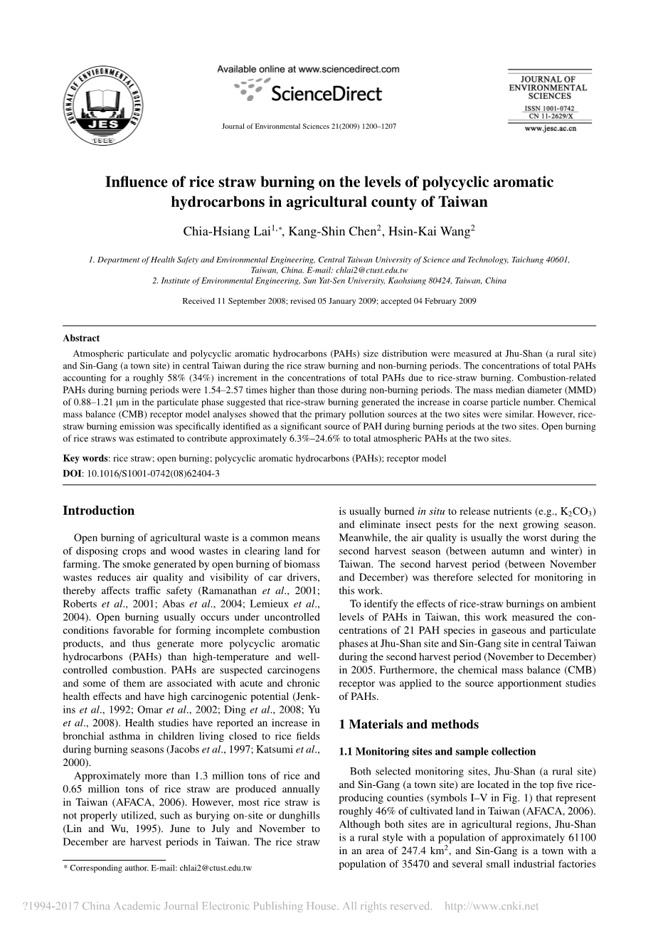 在台湾农业区水稻秸杆燃烧对多环芳烃含量的影响外文翻译资料