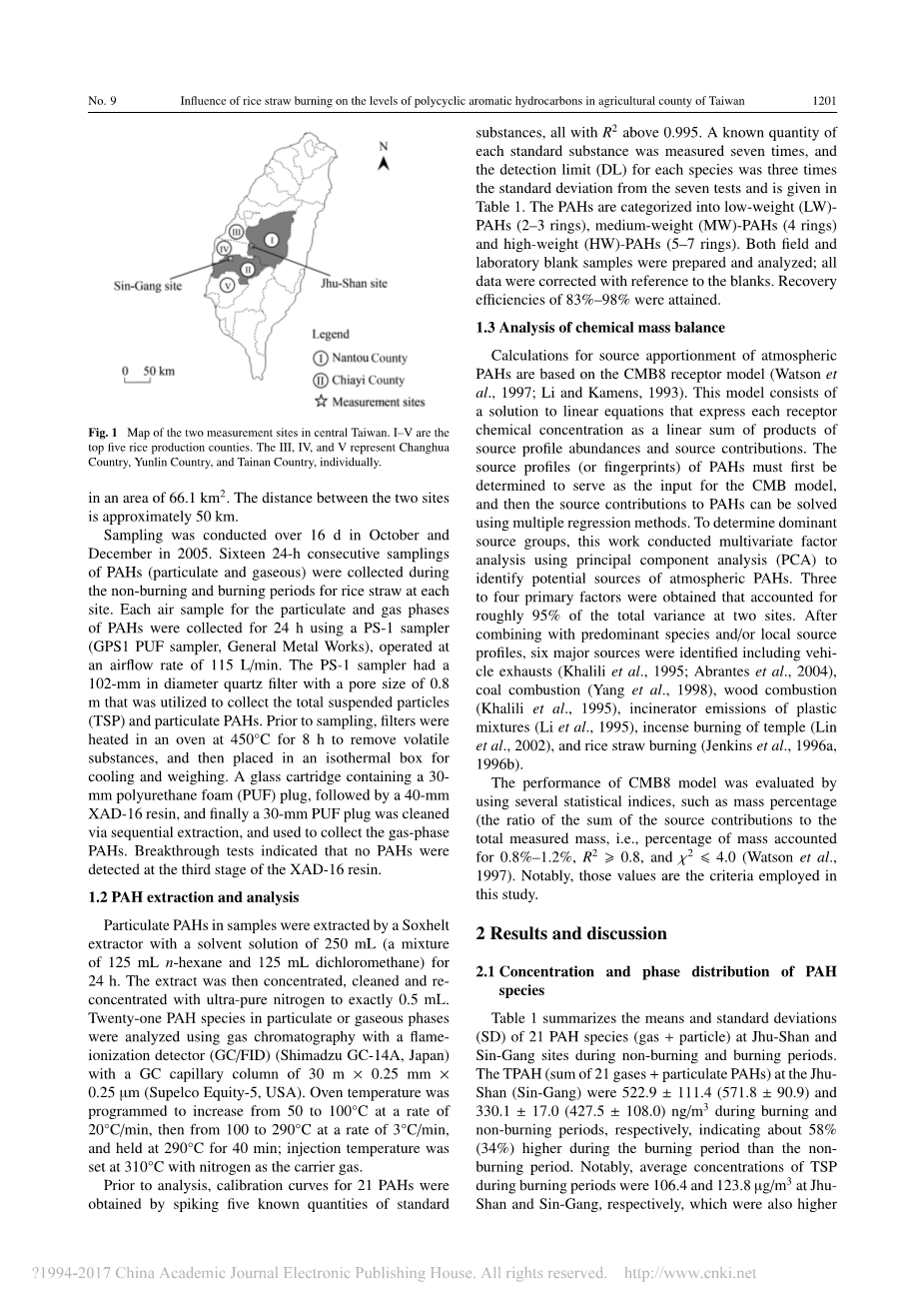 为了确定水稻秸秆燃烧对台湾多环芳烃浓度含量的影响,本次研究在2005年第二次收获期(11 月至12 月)测量了台湾中部竹山镇和新港观测点二十一种PAHs物质的浓度。此外,化学质量平衡(CMB)受体应用于多环芳烃的来源分配研究。
