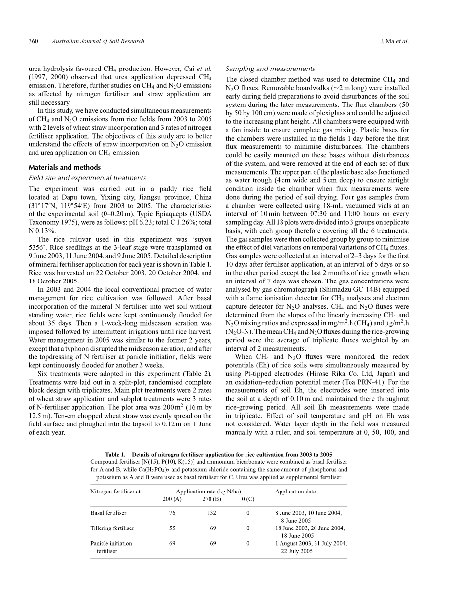 我国农作物秸秆年产量为7.94times;108 t,年增长率为1.25times;107 t。(钟等人.2003年)。我国强烈建议将秸秆还田而不是焚烧,作为长期提高土壤肥力、保护日益恶化的环境的一项措施。在作物秸秆还田的同时,通常建议添加一定量的氮肥,以保持土壤碳氮平衡。毫无疑问,施用氮肥和秸秆对CH4和N2O排放有影响。然而,有关秸秆掺入对N2O排放的影响和尿素对CH4排放的影响的报道结果是相互矛盾的。黄等人(1999年)报告说,作物残渣分解产生的化感物质可抑制土壤N2O的产生。蔡等人(2001年)观察到,在70%持水量处理中,添加秸秆的N2O明显少于不添加秸秆的处理,以及蒋等人(2003年)发现稻草的掺入降低了稻田的N2O排放。相反,Avalakki等人(1995年)和邹等人(2001年)报告说,在土壤中添加麦秸可促进反硝化和随后的N2O排放。。Baggs等人(2000年)和黄等人(2004年)发现,作物残渣的加入增加了N2O的排放量。至于尿素,林道等(1991年)报告说,CH4排放随着尿素施用量的增加而增加。并且王等人(1992年)发现土壤pH值随尿素水解而增加有利于CH4的生产。然而,蔡等人(1997、2000年)观察到施用尿素可减少CH4排放。因此,有必要进一步研究氮肥和秸秆施用对CH4和N2O排放的影响。在本研究中,我们同时测量了2003至2005年稻田CH4和N2O的排放量,同时测定了小麦秸秆掺入量和3种氮肥施用量。本研究的目的是为了更好地了解秸秆投入对N2O排放和尿素施用对CH4排放的影响。