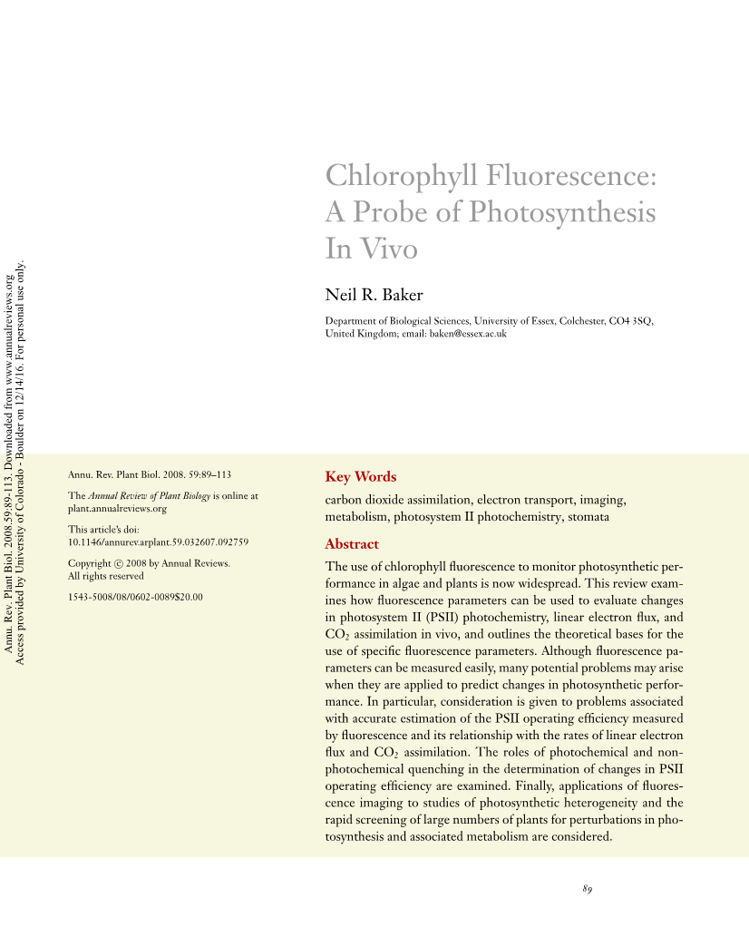 利用藻类和植物的叶绿素荧光合成光合作用的技术现已广泛存在。本文综合考察了多种荧光参数,以及如何用于评估光化学系统II(PSII),线性电子通量和体内CO2同化的变化,并概述了使用特定荧光参数的理论基础。虽然荧光参数可以很容易地测量,但许多潜在问题在应用于预测光合作用性能变化时可能会产生误差。特别是,考虑与精确估计由荧光测量的PSII操作效率及其与线性电子通量和二氧化碳同化速率的关系相关的问题。检测光化学和非光化学猝灭在确定PSII操作效率变化中的作用。最后,研究了荧光成像技术在光合作用异质性研究中的应用,以及在光合作用和相关代谢中扰动大量植物光谱的快速筛选方法。