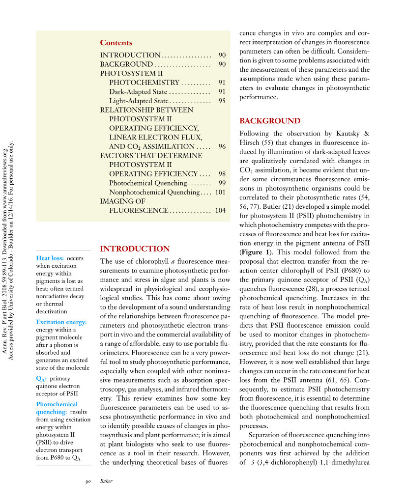 继考茨基&赫希(55)的观察而改变由暗适应叶片与二氧化碳同化的变化定性地相关的照明引起的Fl荧光,很明显,在某些情况下在光合生物Fl荧光排放可以被关联到它们的光合率(54,56,77).Butler(21)开发了一个简单的模型用于在PSII的颜料天线光化学与荧光和热害的过程相互作用能量的光系统II(PSII)光化学(图1)。该模型遵循以下建议:从反应中心PSII(P680)的叶绿素向PSII(QA)的初级醌受体的电子转移淬灭荧光(28),这一过程称为光化学淬灭。热损失速率的增加导致荧光的非光化学淬灭。该模型预测,PSII荧光发射可用于监测光化学变化,只要荧光和热损失的速率常数不变(21)。