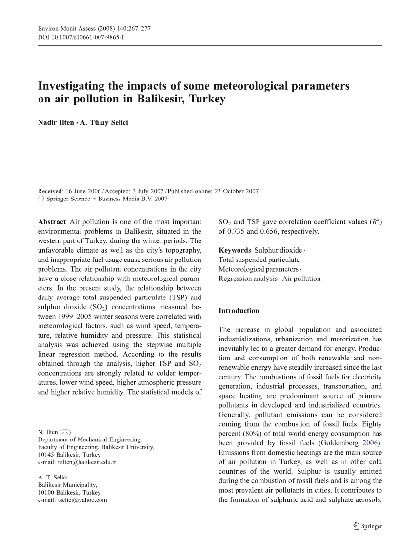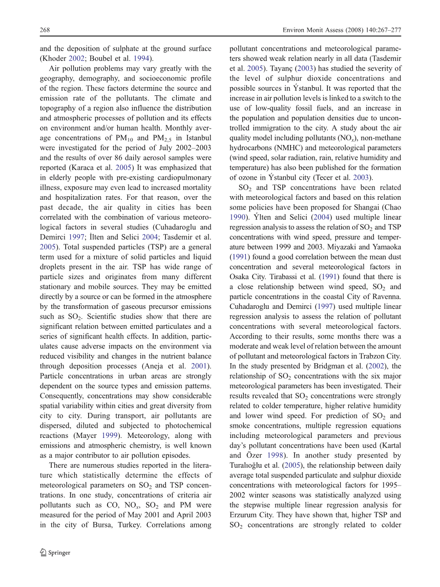 二氧化硫是一种重要的空气污染物,在巴勒克希尔的冬季,类似于许多土耳其的其他城市,它已经与城市空气质量问题密切相关。本研究的目的是评估在巴勒克希尔空气质量的变化,探讨在严重的空气污染事件最有可能发生的冬季(10月到3月)SO2和TSP污染与气象因素如风速、温度、压力和相对湿度的关系。基于巴勒克希尔市的气候和地形的特点,空气质量的原因,调查了1996年- 2005年冬季SO2和TSP浓度与气象因素的组合的关系。