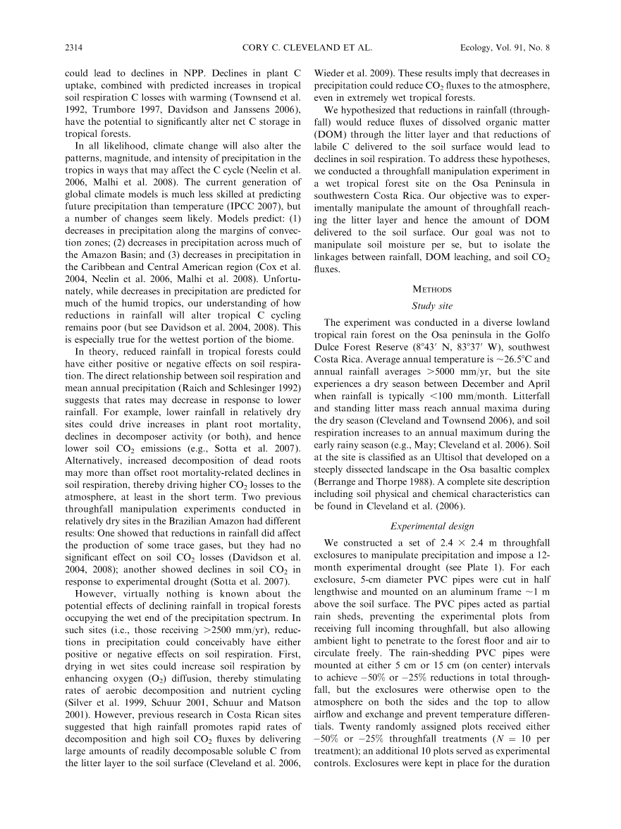 然而,几乎没有人知道位于降水谱湿端的热带森林降雨量减少的潜在影响。在这类区域(即接受gt;2500mm/yr),可以想象,降雨减少可能会导致上述两种对土壤呼吸积极或消极影响的结果。首先,在潮湿的地方干燥可以通过提高O2的通量增加土壤的呼吸,从而刺激有氧分解和营养循环的速率。然而,之前在哥斯达黎加网站的研究表明,高降雨量促使大量易于分解的可溶性C凋零层到土壤表面促进了输送分解速率和高的土壤呼吸CO2通量。这些结果意味着,减少降水可以减少CO2对大气的通量,即使是在极度潮湿的热带森林里。