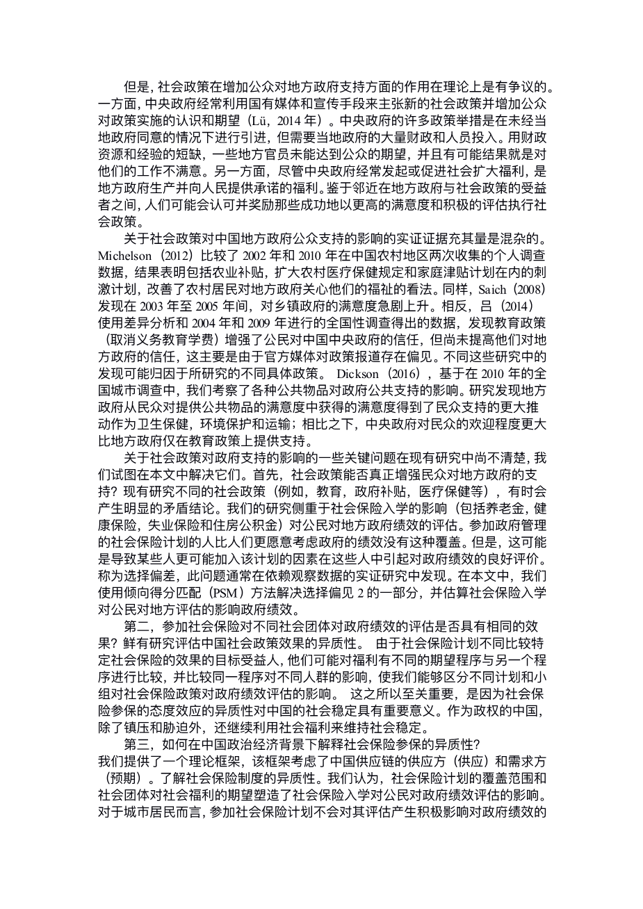 garner public support, the assumption that social benefits can boost public support of government has been rarely tested empirically, especially at the local levels. This article investigates the effects of social insurance enrollment on citizens assessment of local government performance using data from the 2010 China Family Panel Study. We use propensity score matching to reduceselection bias and ordered probit regressions with fixed effects to examine these possible effects.