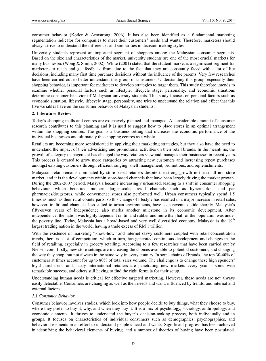 一份报告显示,年轻人(主要是大学年龄段的学生)的消费习惯发生了总体转变,这可能归因于年轻人的额外消费。他们把大部分的钱花在奢侈品牌的衣服和包包,配饰,娱乐和餐饮上。(Ahmed,Ghing hold and Dahari ,2007)也发现,马来西亚学生每月花在购物中心的开支占很大一部分,这显然是马来西亚年轻成年人和他们的钱的最爱,就像他们在西方国家一样。最后,忠实的购物者主要是女性,她们年龄较小,单身,受过高中教育,收入水平不尽相同。