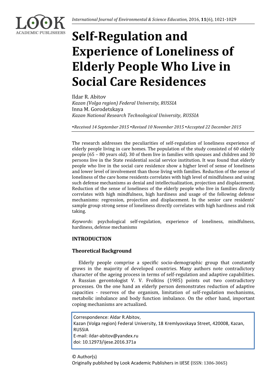 摘要:该研究解决了住在养老院的老年人孤独经历自我调节的特点。研究人群由 60 名老年人(65-80 岁)组成。其中30人生活在有配偶和子女的家庭中,30人生活在国家住宅社会服务机构。研究发现,与有家人居住的老年人相比,居住在社会养老院的老年人表现出更高的孤独感和更低的参与度。减少疗养院居民的孤独感与高度的正念和使用否认和智力化、投射和置换等防御机制有关。家庭中老年人的孤独感降低与高度正念、高度坚韧和使用以下防御机制直接相关:回归、投射和位移。在老年护理居民样本组中,强烈的孤独感与高度的坚韧和冒险精神直接相关。