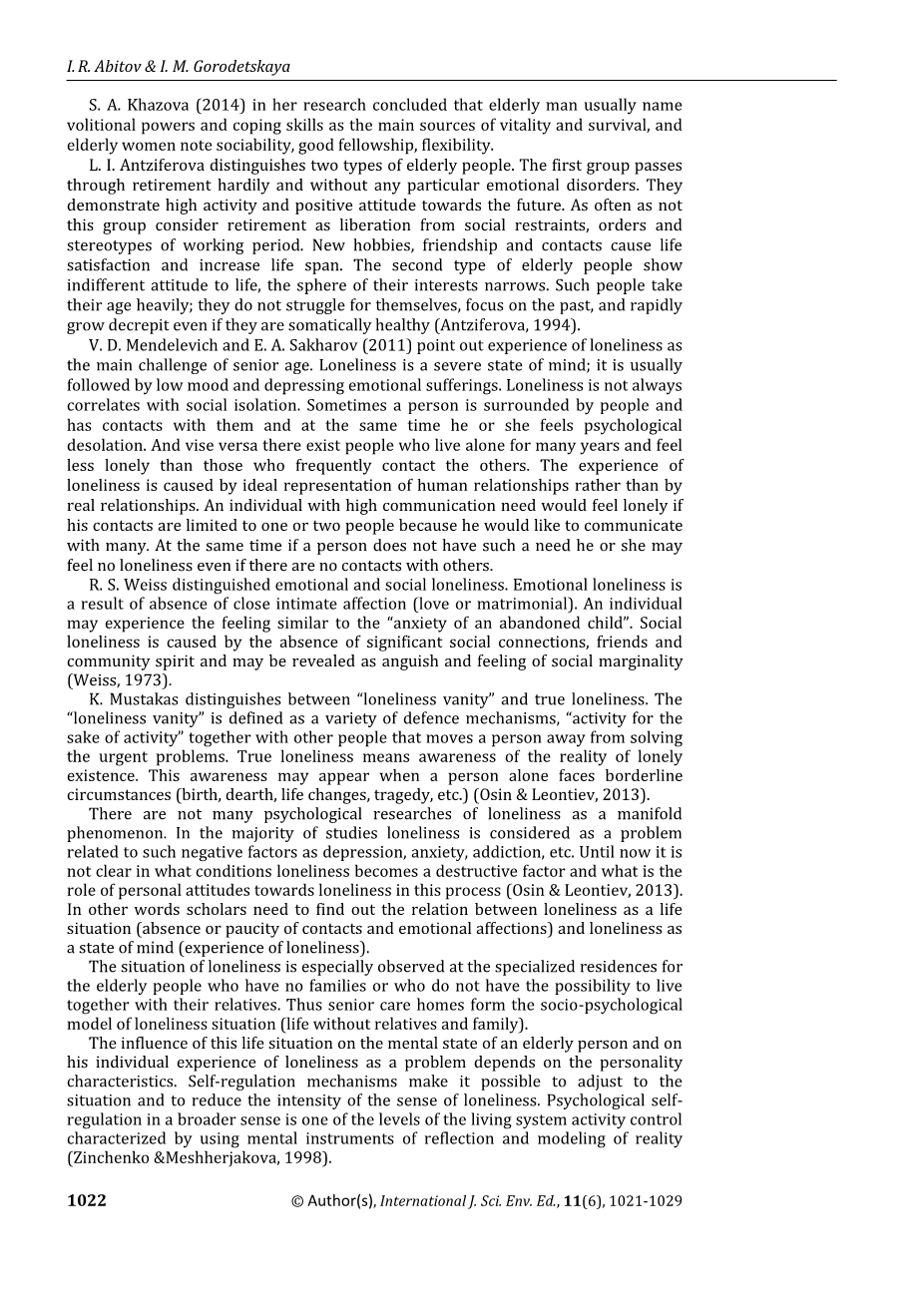 V. D. Mendelevich 和 E. A. Sakharov (2011) 指出孤独的经历是老年的主要挑战。孤独是一种严酷的心态;随之而来的通常是情绪低落和令人沮丧的情绪痛苦。孤独并不总是与社会孤立有关。有时一个人被人包围,与人接触,同时也感到心理上的落寞。反之亦然,有些人独居多年,比经常联系其他人的人更不孤独。孤独的体验是由人际关系的理想表现而不是真实的关系引起的。一个有高度沟通需求的人如果他的联系仅限于一两个人,他会感到孤独,因为他想与很多人沟通。同时,如果一个人没有这种需要,即使不与他人接触,他或她也不会感到孤独。