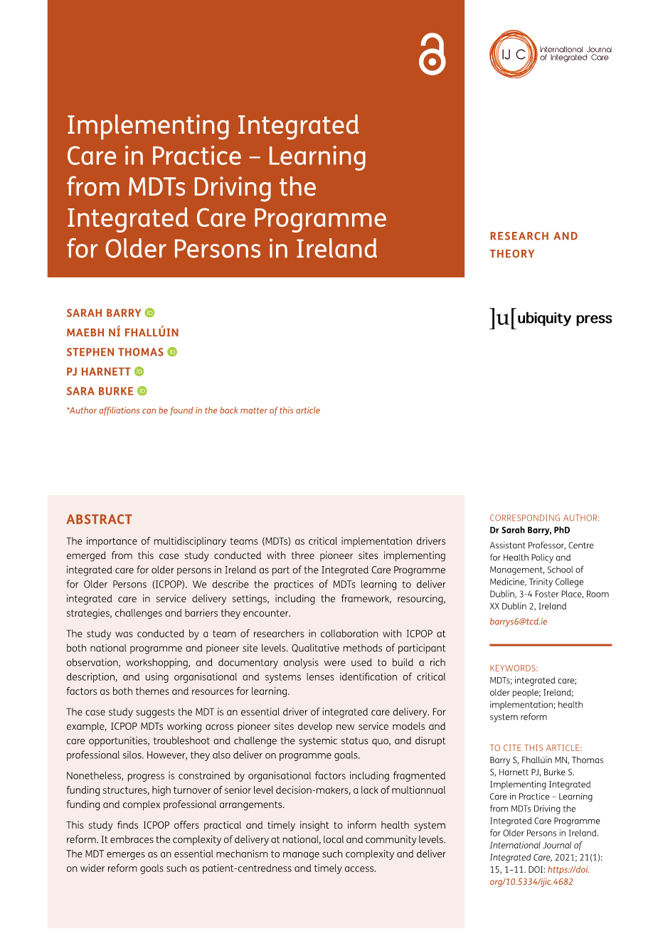 摘要:作为实施驱动关键因素的多学科团队(MDTs)的重要性,可以从这个案例研究中体现,该研究作为老年人综合护理方案(ICPOP)的一部分,在爱尔兰实施老年人综合护理的三个先锋试点开展。我们描述了MDTs 在服务提供环境中学习提供综合护理的实践,包括框架,资源,策略,挑战和遇到的障碍。