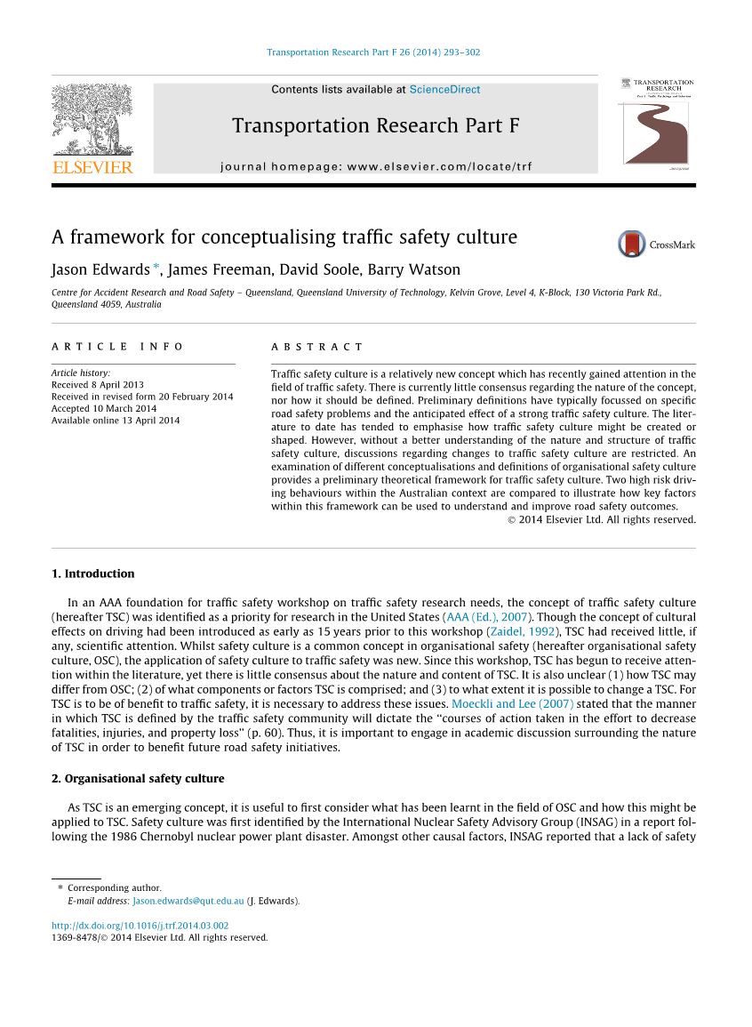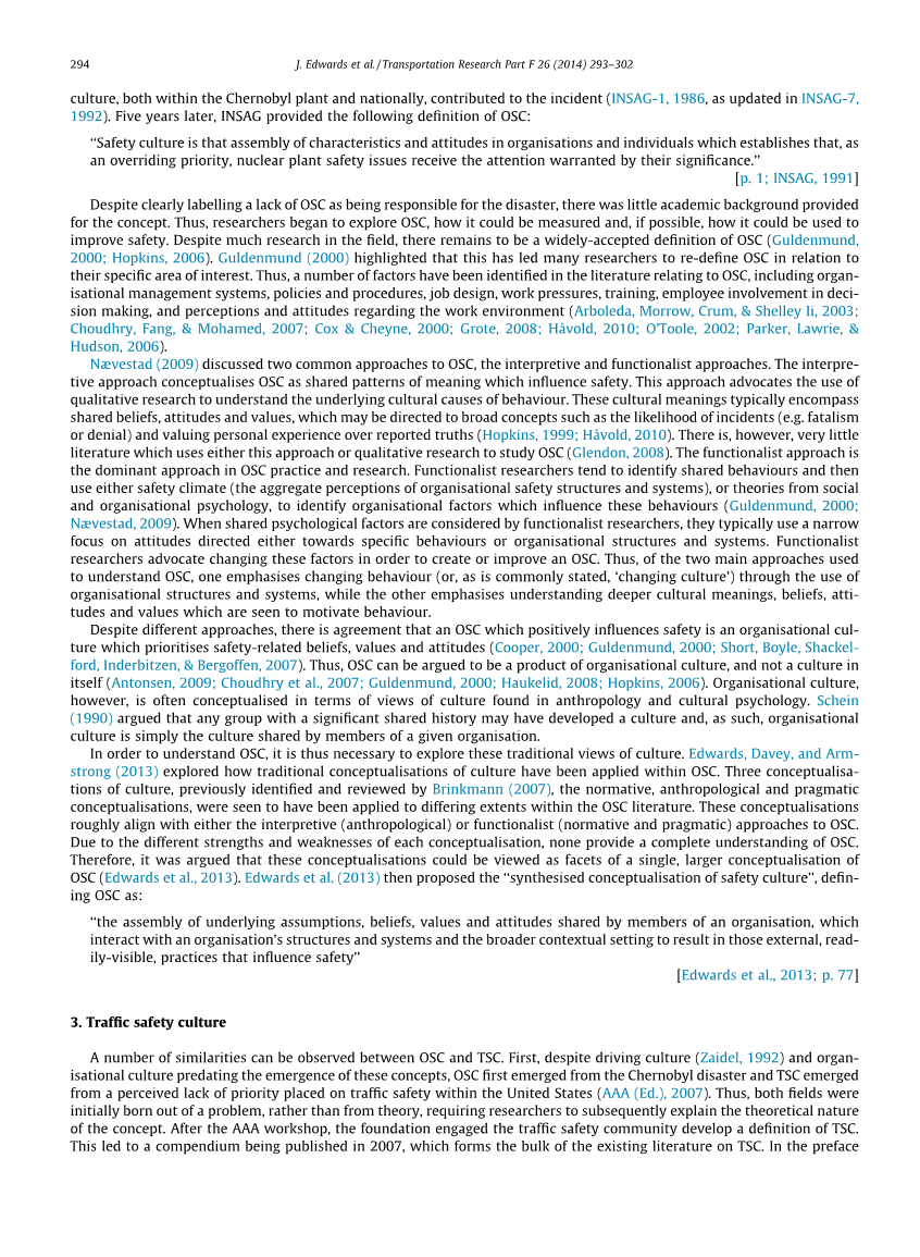 A number of similarities can be observed between OSC and TSC. First, despite driving culture (Zaidel, 1992) and organisational culture predating the emergence of these concepts, OSC first emerged from the Chernobyl disaster and TSC emerged from a perceived lack of priority placed on traffic safety within the United States (AAA (Ed.), 2007). Thus, both fields were initially born out of a problem, rather than from theory, requiring researchers to subsequently explain the theoretical nature of the concept. After the AAA workshop, the foundation engaged the traffic safety community develop a definition of TSC. This led to a compendium being published in 2007, which forms the bulk of the existing literature on TSC. In the preface of the compendium, a number of statements were made regarding the TSC of the United States, which serve as the earliest descriptions of TSC. It was suggested that, despite 43,000 fatalities each year, there is a general failure to appreciate “the full implications of these tragedies”, and a lack of implementation of proven traffic safety countermeasures able to halve the annual number of fatalities (AAA, 2007). The prevailing TSC in the United States was described as “a culture that accepts loss of life and limb as a price of mobility” (p. ii; AAA, 2007). From these descriptions, the perceived problem which provided the impetus for investigating TSC appears to have been a prevailing acceptance of fatalities, a level of inaction despite viable intervention options being available, and a sense of fatalism. In many ways, this mirrors the INSAG description of a lack of safety culture surrounding the nuclear power industry and the need for safety to receive the attention warranted by its significance (INSAG-4, 1991).