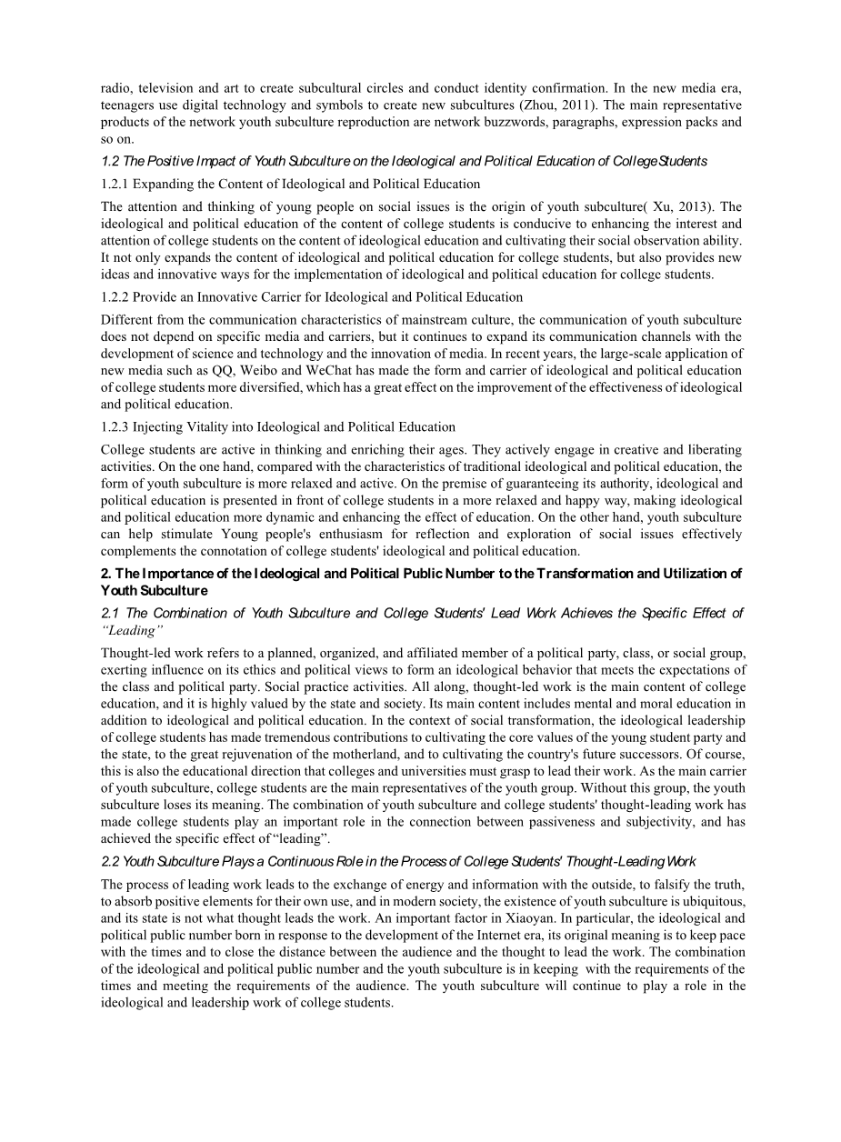 The attention and thinking of young people on social issues is the origin of youth subculture( Xu, 2013). The ideological and political education of the content of college students is conducive to enhancing the interest and attention of college students on the content of ideological education and cultivating their social observation ability. It not only expands the content of ideological and political education for college students, but also provides new ideas and innovative ways for the implementation of ideological and political education for college students.