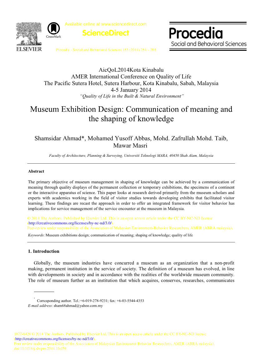 博物馆管理塑造知识的主要目的可以通过沟通来实现通过永久收藏或临时展览的质量展示,一个大陆的标本或科学的交互式设备。 本文考察了主要来自博物馆学者的研究访问学者研究领域的学者专家,开发出促进访客的展品学习。 这些发现是为了提供访问者行为的综合框架而重新设计的方法对马来西亚博物馆服务遇到的服务管理的影响。copy;2014作者。 由Elsevier Ltd.出版由协会负责的选择和同行评议马来西亚环境行为研究人员AMER(马来西亚ABRA)。