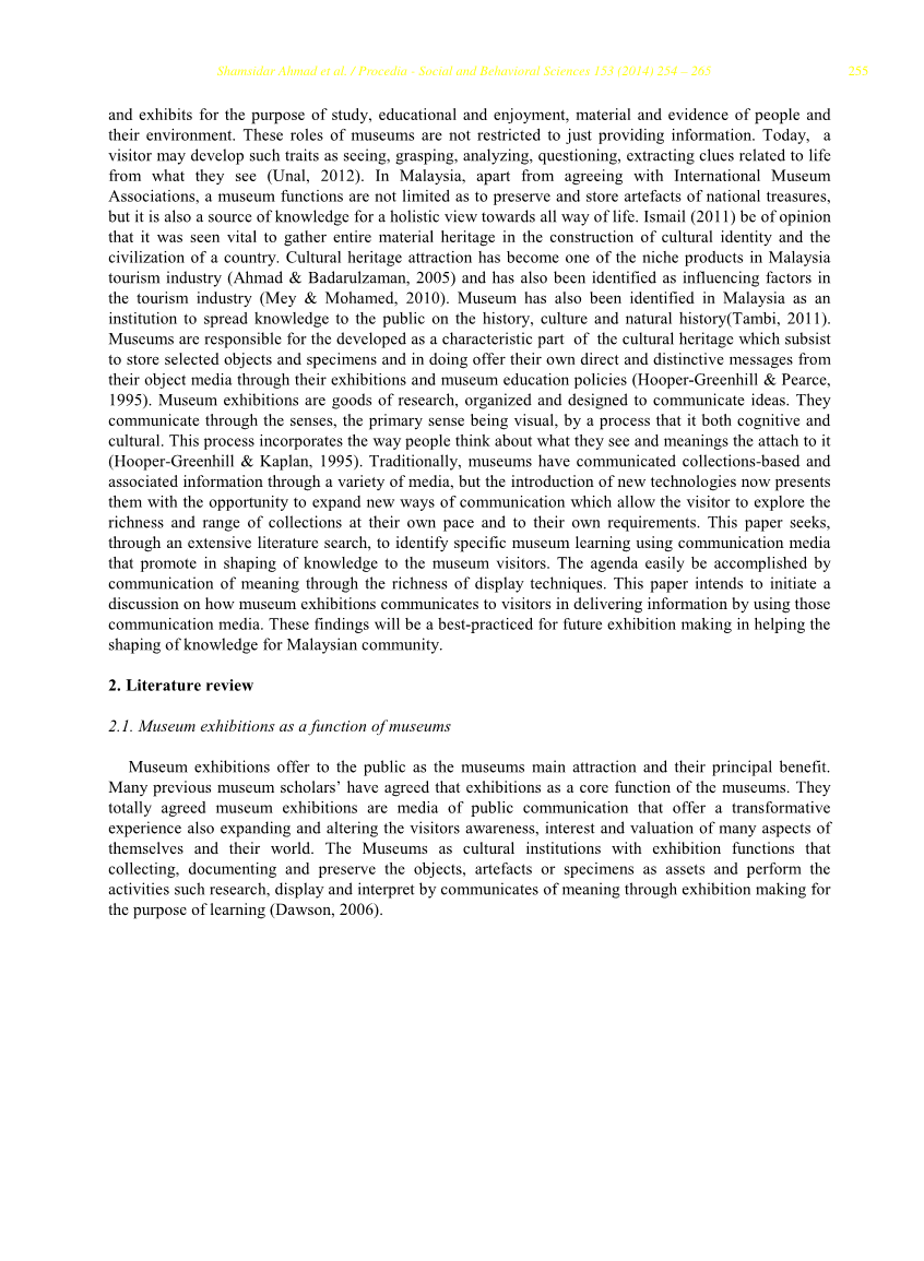 访客可能会发现看到,掌握,分析,提问,提取与生活有关的线索等特征从他们看到的(Unal,2012)。在马来西亚,除了同意国际博物馆协会,博物馆的功能不限于保存和存放国宝的文物,但它也是对所有生活方式的整体观点的知识来源。伊斯梅尔(2011)认为在文化认同建设中收集整个物质遗产至关重要一个国家的文明。文化遗产吸引已成为马来西亚的一个利基产品旅游业(Ahmad&Badarulzaman,2005),也被确定为影响因素旅游业(Mey&Mohamed,2010)。博物馆也被确定为马来西亚将知识传播给公众的历史,文化和自然史(Tambi,2011)。