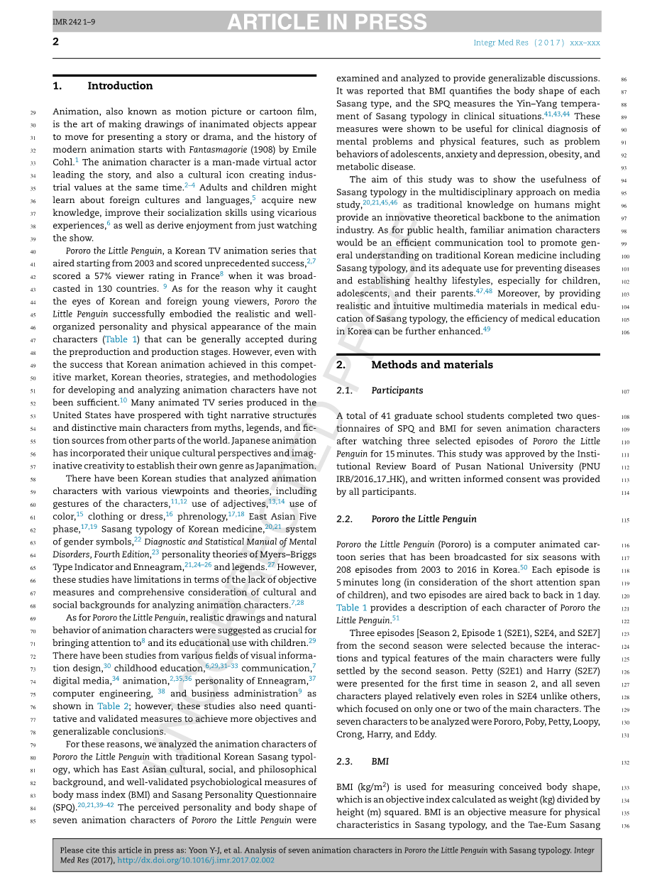 由于这些原因,我们分析了传统韩国四象类型小企鹅Pororo中的动画人物,其具有东亚文化,社会,哲学背景,以及有效的心理生理测量身体质量指数(BMI)和Sasang人格问卷(SPQ)。小企鹅Pororo中的7种动画人物的人格和身体形状被进行检测与分析,以此提供普遍性的讨论。据报道,BMI量化了每个四象型身材,SPQ测量了阴–阳气质四象类型在临床中的情况。这些措施被证明对于临床诊断的心理问题和物理特征是有用的,如青少年的问题行为,焦虑和抑郁,肥胖和代谢性疾病。