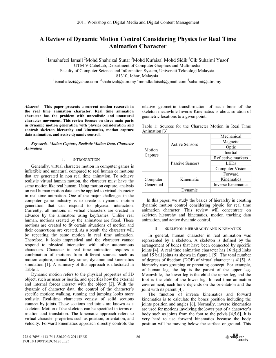 本文对基于物理的实时动画动态运动生成控制的主要部分进行了综述。这些主要部件可分为三类:(a)骨架层次结构和运动学;(b)运动捕捉数据动画;(c)主动动态控制。这篇综述对学生和研究人员理解实时动画中角色运动的概念和技术非常重要。