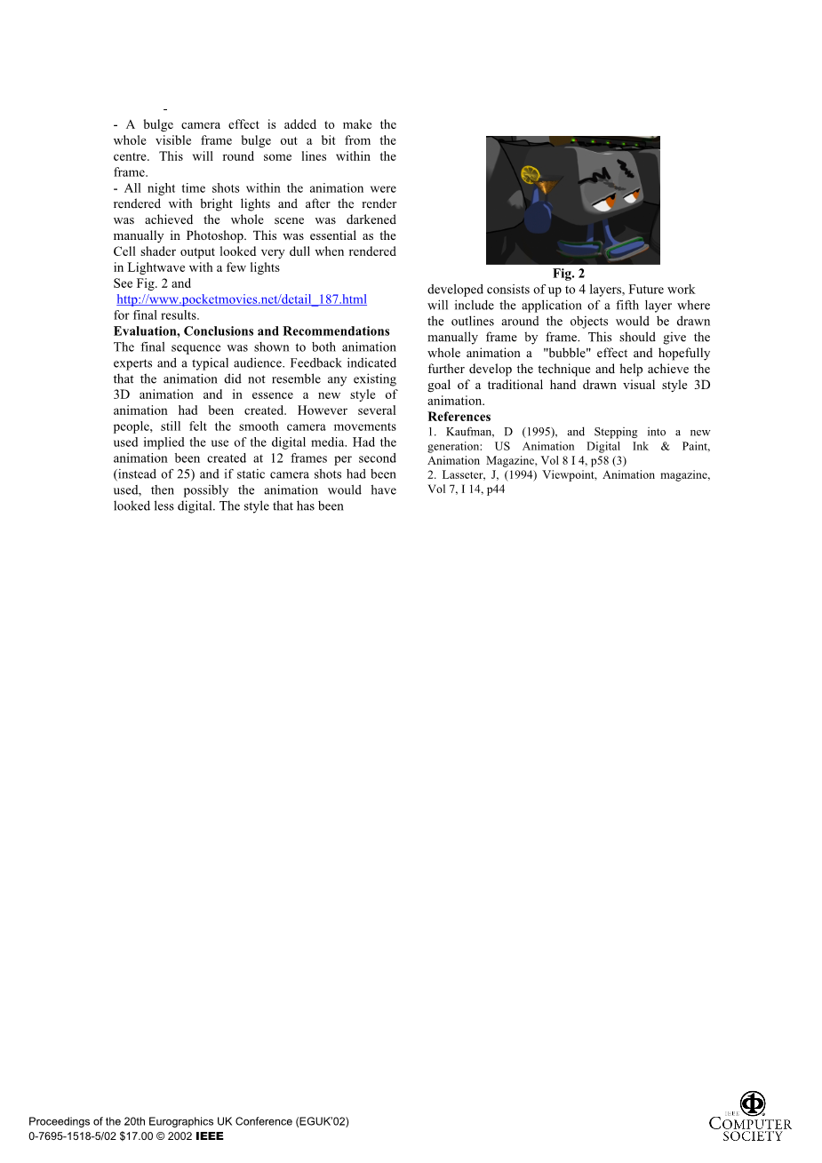 反馈表明,动画与任何现有动画都不相似3D动画本质上是一种新的风格动画已经创建。不过有些人,仍然感觉到相机的流畅动作使用暗示使用数字媒体。有过动画以每秒12帧的速度创建(而不是25)如果是静态相机镜头使用,然后动画可能会有看起来不那么数字一直以来的风格图2开发包括最多4层,未来的工作将包括应用第五层的地方将绘制对象周围的轮廓逐帧手动。这应该给整个动画一个“泡沫”效应,并希望进一步发展技术,帮助实