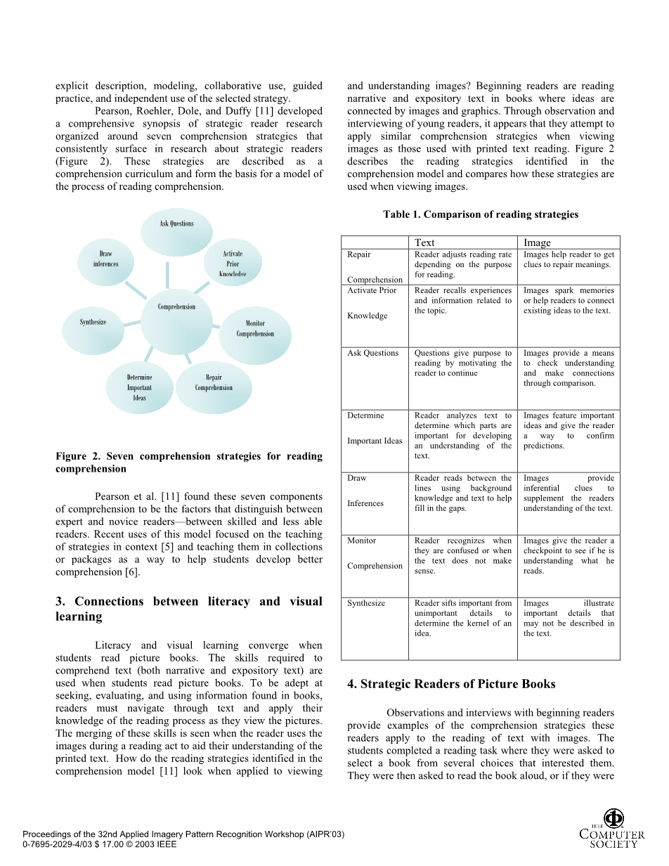 一种方法来回答如何儿童对图像的理解是从我们所知道的印刷文本的战略性读者开始的:他们倾向于使用一套理解策略[4;9)。研究的重点是识别和指导这些策略,因为糟糕的读者似乎缺乏这些策略,不知道何时以及如何应用他们所掌握的知识。Paris, Cross和Lipson得出结论,学生可以通过知情的直接指导来了解阅读策略的存在。Duke和Pearson建议应该包括一个理解教学模型明确描述、建模、协作使用、指导实践和独立使用所选策略。皮尔逊、罗勒、多尔和达菲开发了战略读者研究的综合大纲,围绕着七个始终在战略读者研究中出现的理解策略组织起来。这些策略被描述为理解课程,并构成阅读理解过程模型的基础。