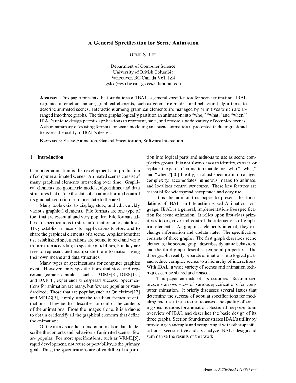 计算机图形学有多种规格。但是,只有存储和表示几何模型的规范(如3DMF[3]、IGES[13]和DXF[4])才能获得广泛的成功。动画的规格很多,但很少流行或标准化。那些流行的,如QuickTime[12]和MPEG[9],只存储动画的合成帧。它们既不描述也不控制动画的内容。仅从图像中,很难获取或识别定义动画的所有图形元素。