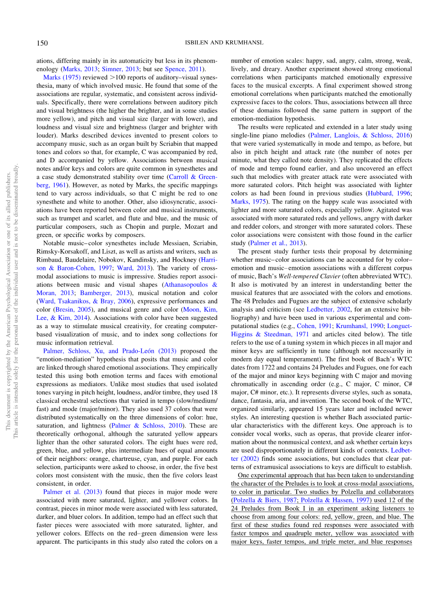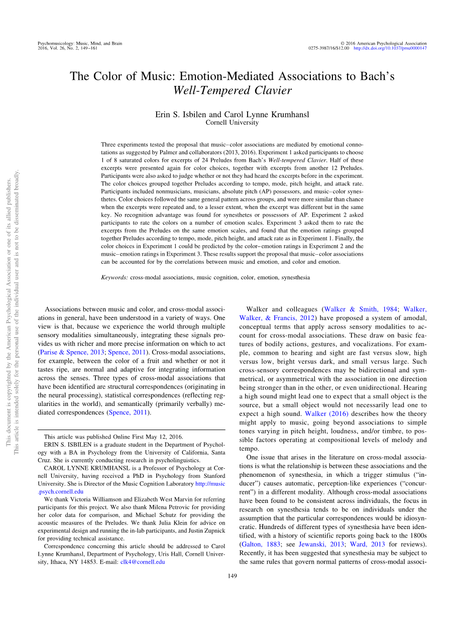 我们感谢Victoria Williamson和Elizabeth West Marvin为这个项目推荐了参与者。我们也感谢Milena Petrovic提供她的颜色数据进行比较,并感谢Michael Schutz提供了Preludes的声学效果。我们感谢Julia Klein对实验设计和运行实验参与者的建议,以及Justin Zupnick提供的技术帮助。有关本文的通讯,请致信纽约州伊萨卡市康奈尔大学尤里斯·霍尔学院心理学系Carol Lynne Krumhansl,纽约14853。E-mail:clk4@cornell.edu