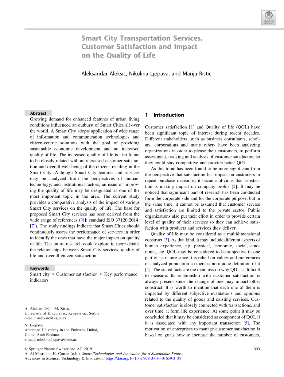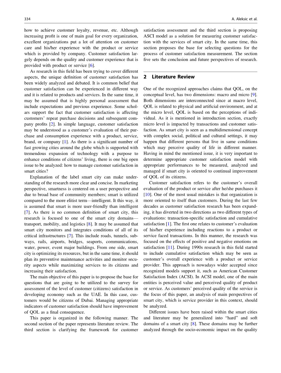 一种公认的方法声称,生活质量在概念层面上有两个维度:宏观和微观[9]。这两个维度是相互联系的,因为在宏观层面上,生活质量与物理和人工环境有关,而在微观层面上,生活质量是基于个人的感知。正如简介部分所提到的,微观层面受到交易和顾客满意度的影响。智慧城市是一个多维的概念,有着复杂的社会、政治和文化背景,不同的人生活在相同的条件下,可能会以不同的方式感知生活质量。考虑到上述问题,如果智慧城市的目标是持续提高市民的生活质量,那么确定合适的客户满意度模型并对其进行测量、分析和管理是非常重要的。