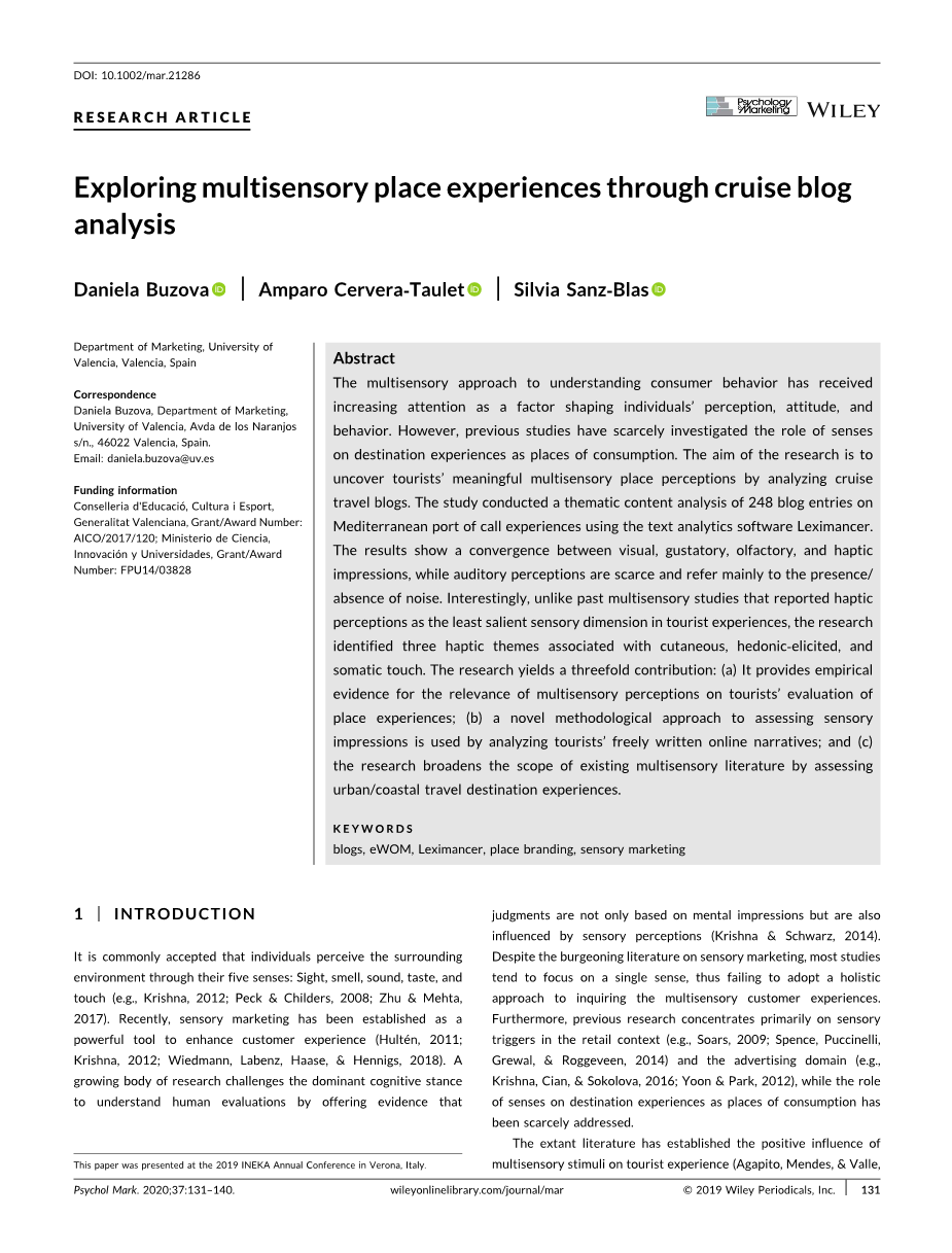 摘要:理解消费者行为的多感官方法作为塑造个人感知、态度和行为的一个因素,已经受到越来越多的关注。然而,以往的研究很少研究感官作为消费场所对目的地体验的作用。本研究的目的是通过对邮轮旅游博客的分析,揭示游客有意义的多感官场所感知。这项研究使用文本分析软件Leximizer对248篇关于地中海停靠港经历的博客条目进行了主题内容分析。结果表明,视觉、味觉、嗅觉和触觉印象之间存在趋同,而听觉知觉很少,主要指存在/不存在噪音。有趣的是,与过去的多感官研究报告触觉是旅游体验中最不显著的感觉维度不同,这项研究确定了三个与皮肤、享乐引发的触觉和躯体触摸相关的触觉主题。这项研究有三个贡献:它为多感官知觉与游客对场所体验的评价之间的相关性提供了实证证据;通过分析游客自由书写的在线叙事,使用了一种新的方法来评估感官印象;通过评估城市/沿海旅游目的地体验,本研究拓宽了现有多感官文学的范围。