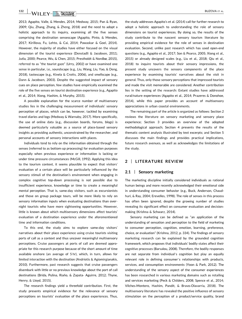 这项研究成果有三方面的贡献。首先,本研究提供了经验证据,证明感官知觉对游客评价场所经验的相关性。因此,本研究针对Agapito s et al.(2014)呼吁进一步研究采用整体的方法来理解感知维度在旅游体验中的作用。这样,研究结果通过提供经验证据来证明感官在目的地评估中的作用,从而为新生的感官旅游文学做出了贡献。 其次,与过去的研究使用开放式问题或已经设计好的量表来询问游客的感官印象不同,本研究通过检查游客对访问的总体叙述来揭示场所体验的感觉成分。 因此,仅考虑那些给游客留下深刻印象并使之印象深刻的感觉。 另一个贡献在于研究的背景:现有的研究已经针对农村/自然经验,而本文提供了对城市沿海环境中多感官升值的说明。 本文的其余部分安排如下:第2节回顾了有关感官营销和感官体验的文献; 第三部分概述了所采用的方法论方法; 第4节介绍了主题内容分析的结果,摘录内容如下: 第5节讨论了主要发现,并提供了实际的含义,未来的研究途径以及承认研究的局限性。