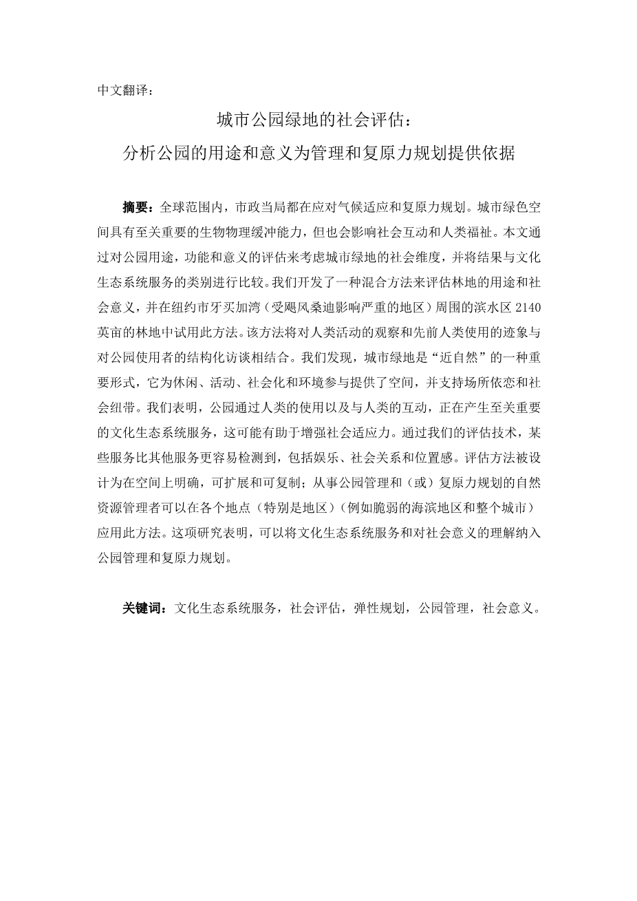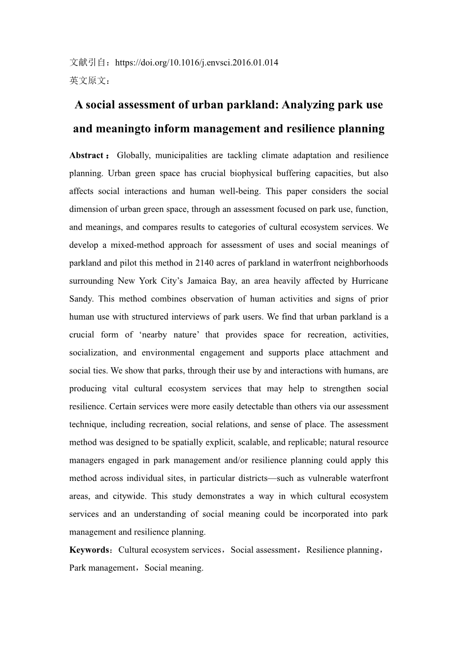 城市公园绿地的社会评估: 分析公园的用途和意义为管理和复原力规划提供依据外文翻译资料