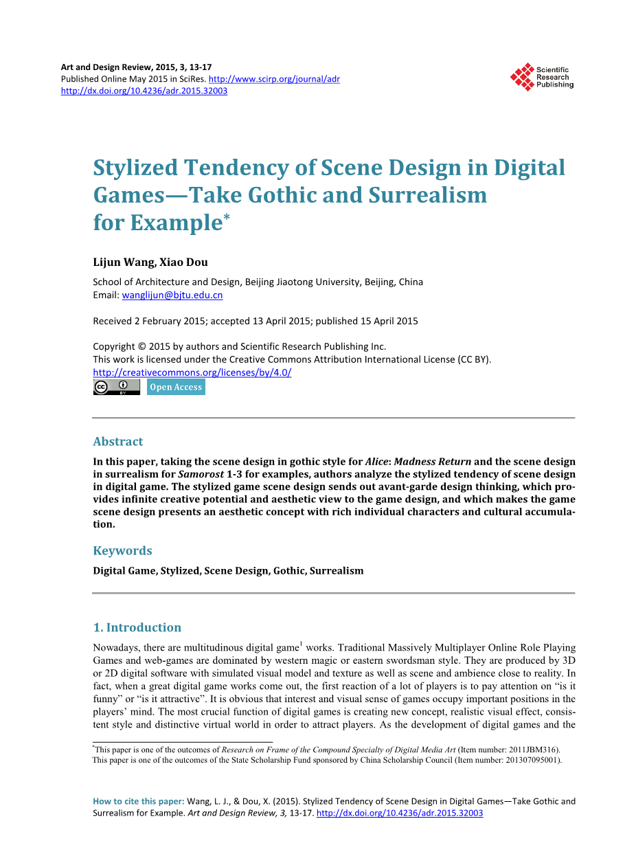 摘要:本文以《爱丽丝:疯狂的回归》的哥特式场景设计和《萨莫洛斯特 1-3》的超现实主义场景设计为例,分析了数字游戏中场景设计的程式化倾向。程式化的游戏场景设计给游戏设计带来了前卫的设计思想,为游戏设计提供了无限的创造潜力和美学视角,使游戏场景设计呈现出丰富的个性化特征和文化积淀的美学理念。