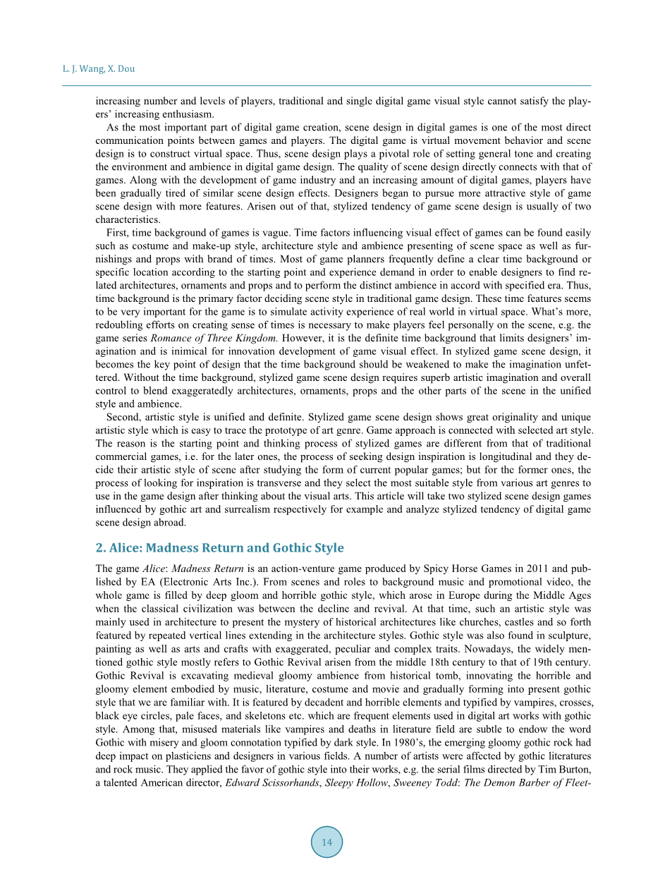 《爱丽丝:疯狂归来》是一款动作冒险游戏,由麻辣马游戏公司于 2011 年制作,并由 EA(电子艺术公司)出版。从场景和角色到背景音乐和宣传视频,整个游戏充满了深深的忧郁和可怕的哥特式风格,这种风格出现在中世纪的欧洲,当时古典文明正处于衰落和复兴之间。当时,这种艺术风格主要应用于建筑中,通过在建筑风格中重复延伸的垂直线条来展现教堂、城堡等历史建筑的神秘。哥特式风格在雕塑、绘画以及工艺美术中也有所体现,具有夸张、奇特和复杂的特点。如今,广泛流行的哥特式风格大多是指 18 世纪中叶至 19 世纪兴起的哥特复兴风格。哥特复兴运动是从历史坟墓中挖掘出中世纪的阴郁氛围,革新音乐、文学、服装、电影等体现的恐怖与阴郁元素,逐渐形成我们所熟悉的现代哥特风格。它的特点是颓废和可怕的元素和典型的吸血鬼,十字架,黑眼圈,苍白的面孔,骨骼等等,这些是数字艺术作品中经常使用的哥特式风格的元素。其中,滥用的材料,如吸血鬼和文学领域的死亡,微妙地赋予这个词的苦难和阴暗的内涵哥特式典型的黑暗风格。20 世纪 80 年代,新兴的阴郁哥特式岩石对塑化剂和各个领域的设计师产生了深刻的影响。许多艺术家都受到了哥特文学和摇滚音乐的影响。他们在作品中运用了哥特式的风格,比如由美国天才导演 TimBurton 执导的系列电影《剪刀手爱德华《理发师陶德》《街头》、《僵尸新娘》、《科学怪狗》是幽默、爱情和恐怖的完美结合;日本动画和汽车卡通作品因其哥特式的洛丽塔风格而流行;上面提到的数字游戏《爱丽丝:疯狂的回归》也是以哥特风格导演的。