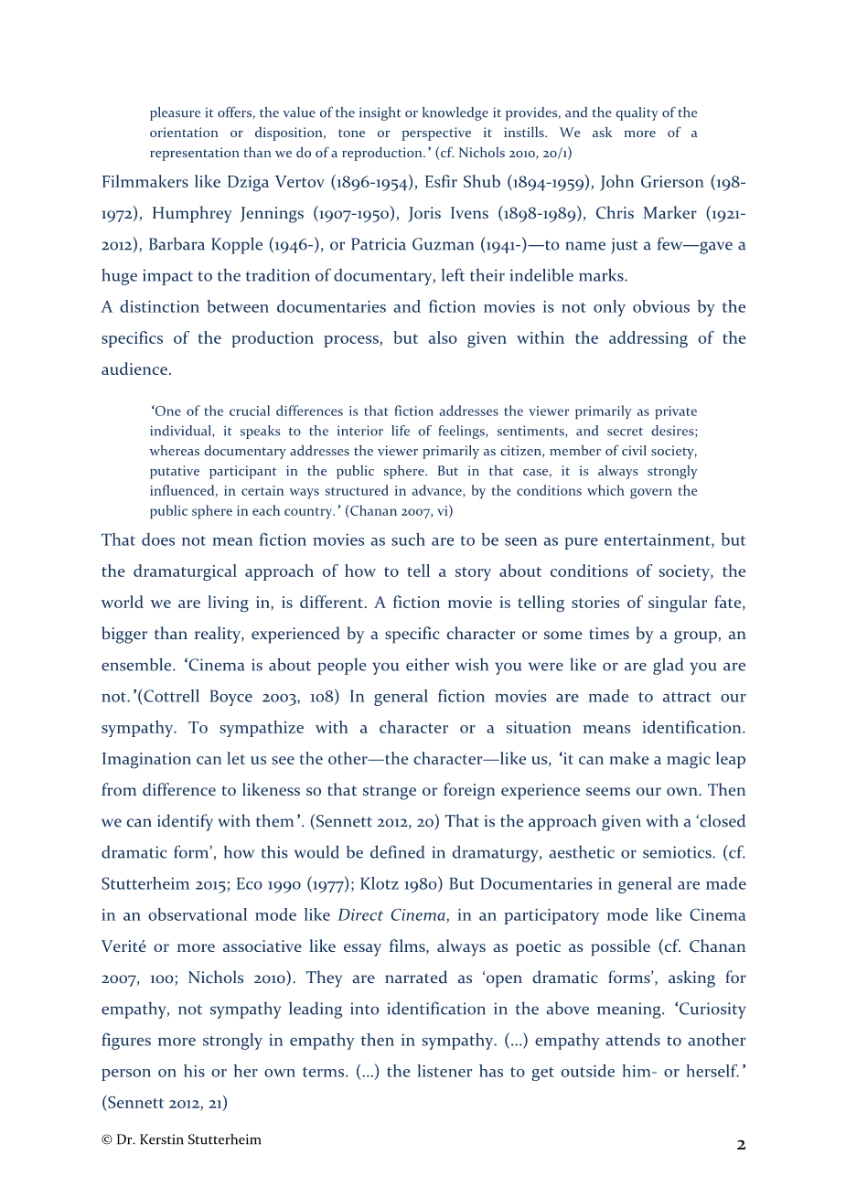 “纪录片”的定义是始终关系或比较。 (......)但是纪录片是不太现实的再现,它是世界的表示,我们已经占据。它代表了世界的特定视图,一个大家可能永远不会有即使全世界的方面,一是我们可能从来没有遇到过遭遇之前,即使是代表了世界各方面都是我们熟悉的。我们判断一个再现其忠实于原始的能力看起来像,像,全心全意同样用途的原稿。我们判断的表示更受的性质copy;克斯廷Stutterheim2博士乐趣它提供的洞察或它提供知识的价值,和的质量定向或处置,音调或灌输的观点。我们要求更多的表现比我们做了再现。“(参见2010尼科尔斯,20/1)