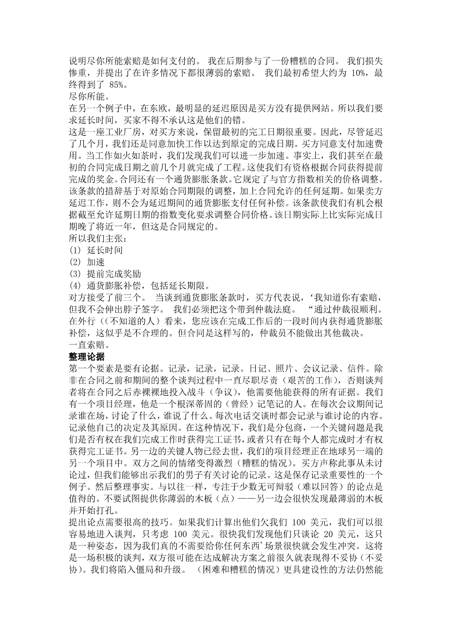 By education, such as reading good books on the subject of negotiations, and by training, most people can however improve their skills as negotiators in all styles. Lets return to the subject of claims with an example of how it pays to claim all you can. I was involved at a late stage in a bad contract. We were losing heavily and put in claims which were weak in many cases. We originally hoped for about 10% and ended up with 85%.