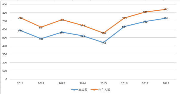 图1.1 2011-2018年全国建筑业发生事故起数及事故死亡人数年度分布图