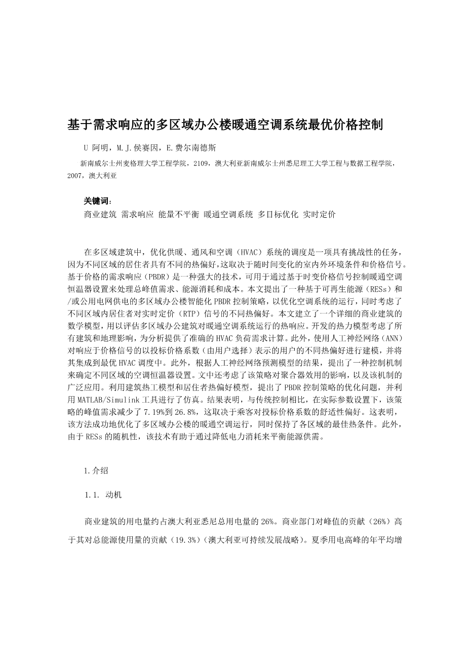 基于需求响应的多区域办公楼暖通空调系统最优价格控制外文翻译资料
